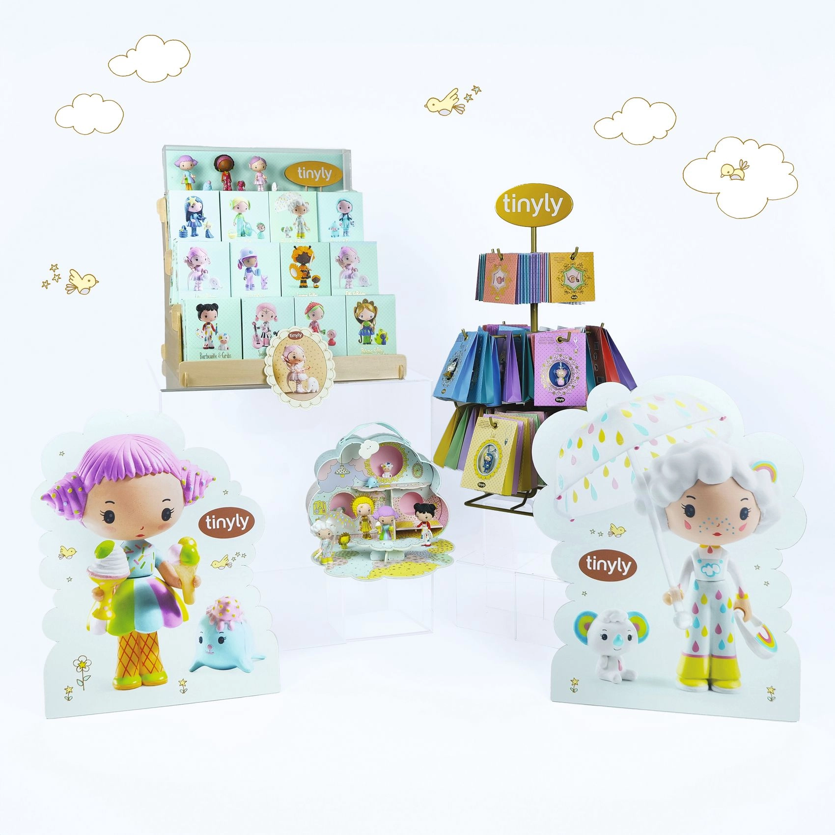 Promocijske kartonske silhuete Tinyly znamke DJECO so zasnovane za vizualno privlačen merchandising. Odlikuje jih nežen ilustrativni slog, ki se ujema z otroško ponudbo in pomaga povečati pozornost kupcev tako v izložbi kot v notranjosti trgovine.