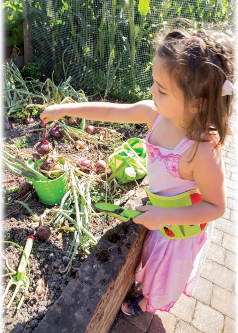 Praktičen tekstilni pas varno hrani lopatko, grabljice in rokavice ter jih ima vedno pri roki. Otroci lahko prosto tekajo po vrtu, ne da bi izgubljali orodje.