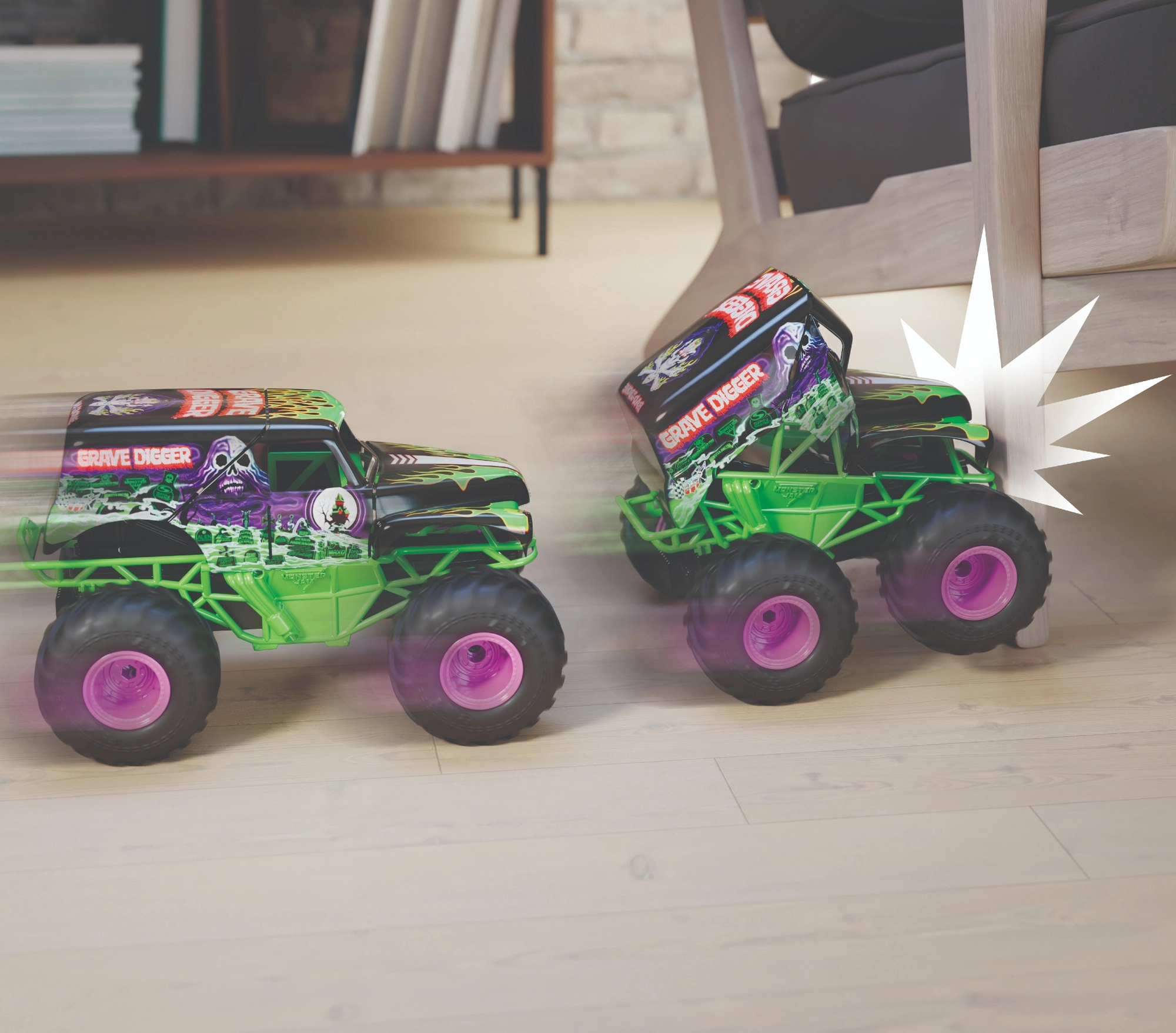 Legendarna ikona MONSTER JAM prihaja v vašo zbirko: GRAVE DIGGER z izrazito črno‑zeleno grafiko, ogromnimi pnevmatikami in povišanim podvozjem. Merilo 1:15 ponuja odlično razmerje med velikostjo in vodljivostjo, medtem ko gumijasti profili zagotavljajo oprijem na asfaltu, preprogi in grobejših površinah.