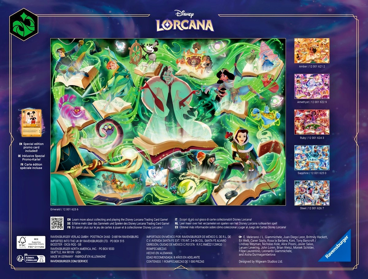 Idealna izbira za družine, oboževalce kartne igre LORCANA in vse, ki imajo radi 1000-delne puzzle z izrazitim motivom. Antirefleksna površina olajša sestavljanje tudi pri umetni osvetlitvi, trpežen karton pa zagotavlja dolgo življenjsko dobo.