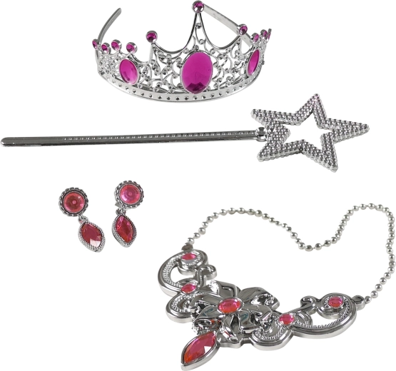 V hipu se preobrazite v očarljivo princeso! Ta komplet vsebuje vse za čarobne preobleke: srebrno krono, čarobno paličico, elegantno ogrlico in bleščeče uhane. Rožnati kamenčki celotnemu setu dodajo pravljičen videz – idealno za pust, rojstnodnevno zabavo in igro princeske doma.