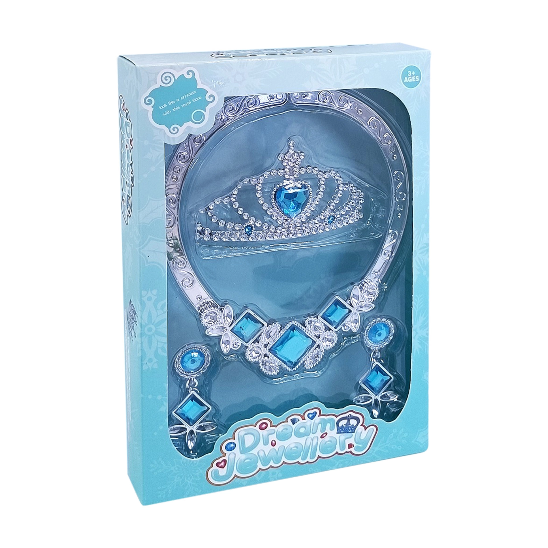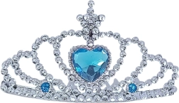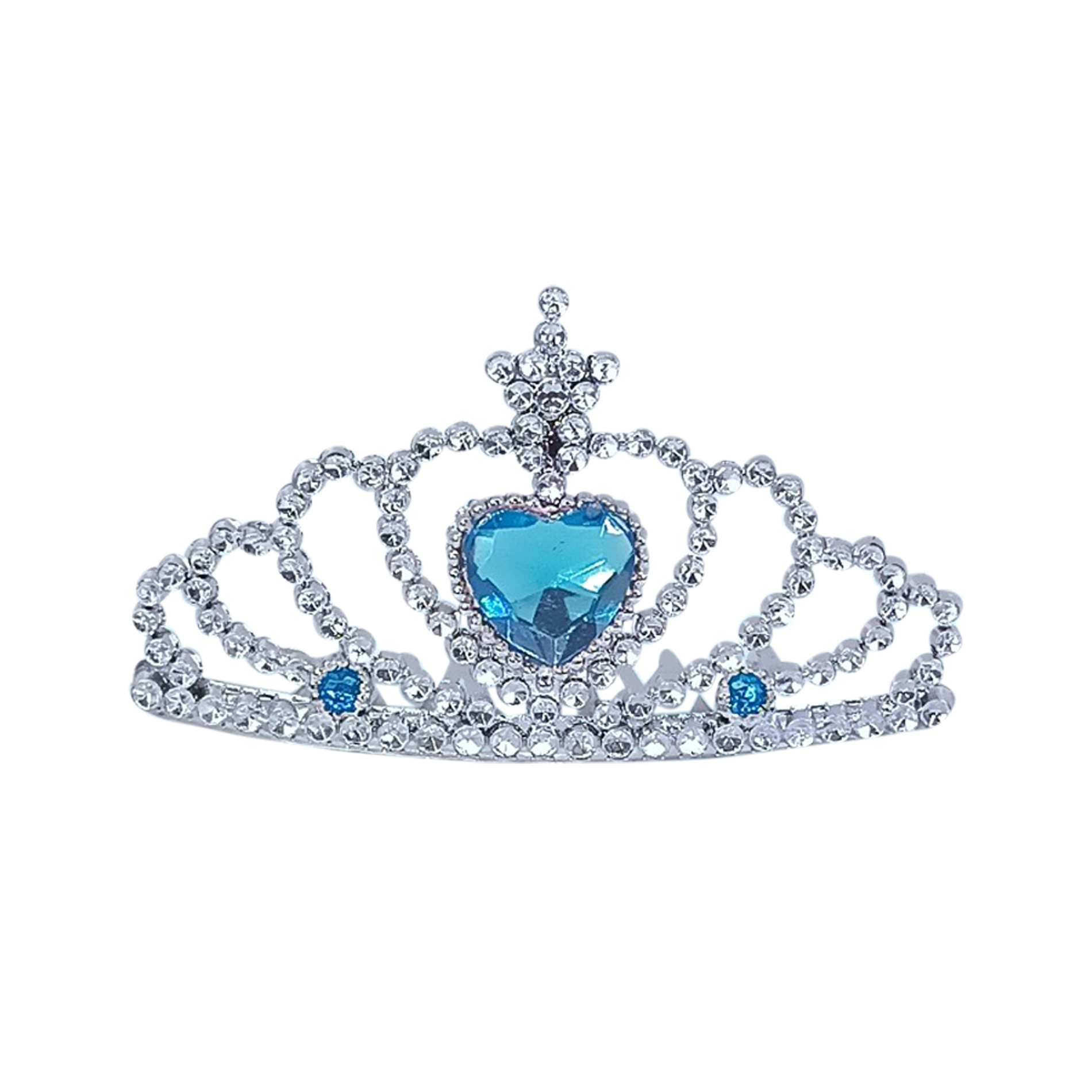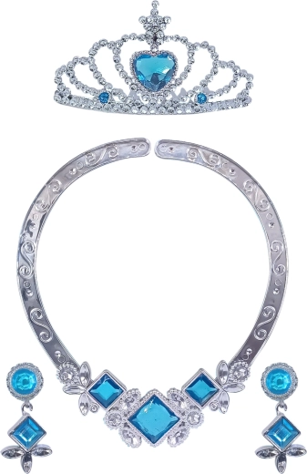 Elegantni otroški komplet dodatkov, ki v hipu vsako deklico spremeni v pravljično princeso. Vsebuje krono, ogrlico in uhane v srebrni barvi z bleščečimi modrimi kamenčki, idealno za pust, otroške zabave in igranje princes.