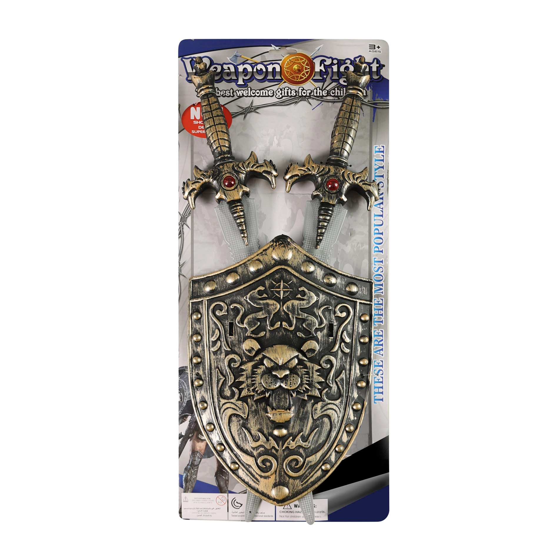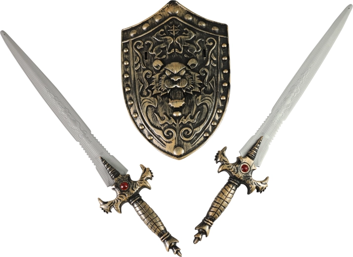 Oprema je zasnovana tako, da dobro sede v otroške roke in prenese intenzivno igro. Ščit nudi zanesljivo »zaščito«, dvojica mečev pa omogoča dvoboj ali igro v paru.