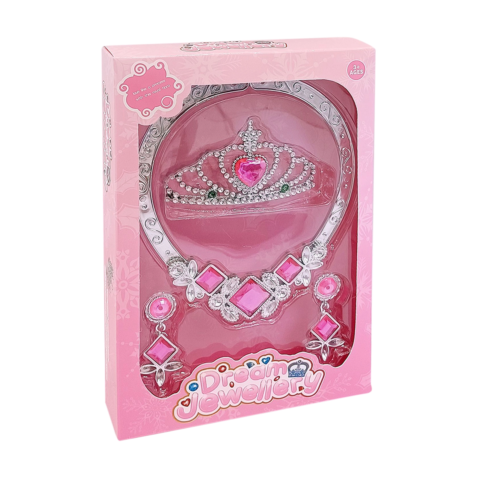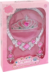 Eleganten komplet dodatkov za male dame, ki vsako deklico spremeni v pravljično princeso. Vsebuje krono, ogrlico in uhane v srebrni barvi z bleščečimi rožnatimi kamenčki. Idealno za kostume, zabave in princesne igre.