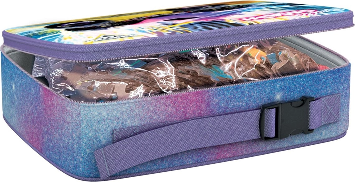 Sestavljanka je shranjena v trdni izotermični torbici z zadrgo in stranskim trakom za enostavno prenašanje. Ohranite kose pregledno skupaj doma in na poti.