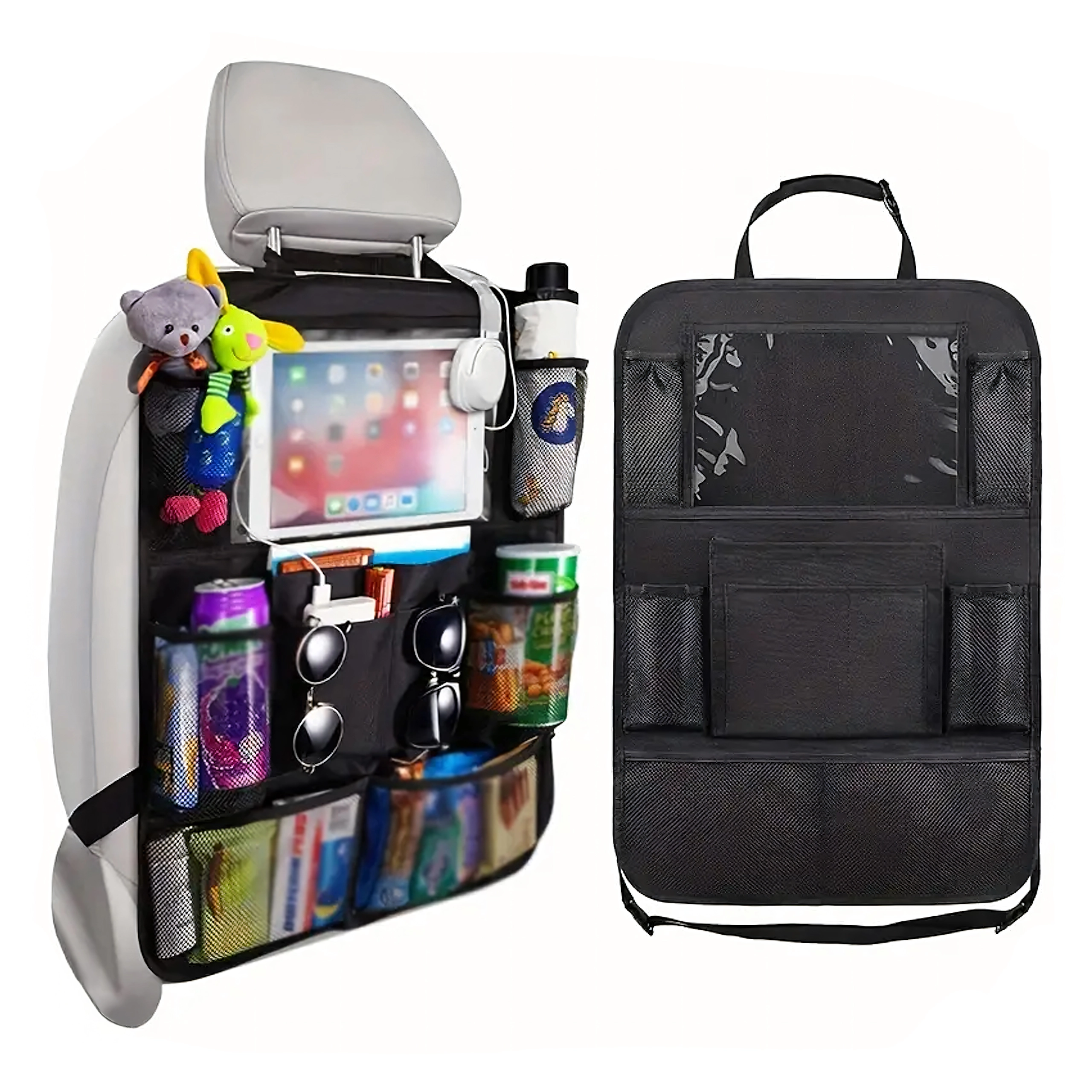 Ta univerzalen organizator za zadnjo stran avtomobilskega sedeža spremeni vsak družinski izlet in dnevno vožnjo v udobno in pregledno izkušnjo. Zahvaljujoč številnim žepom – vključno s stranskimi mrežastimi žepi za steklenice, zadrgnjenimi in odprtimi predalčki – boste imeli vse potrebščine lepo urejene. Prozoren žep za tablico omogoča otrokom gledanje risank ali igranje iger, medtem ko avto ostane pospravljen.