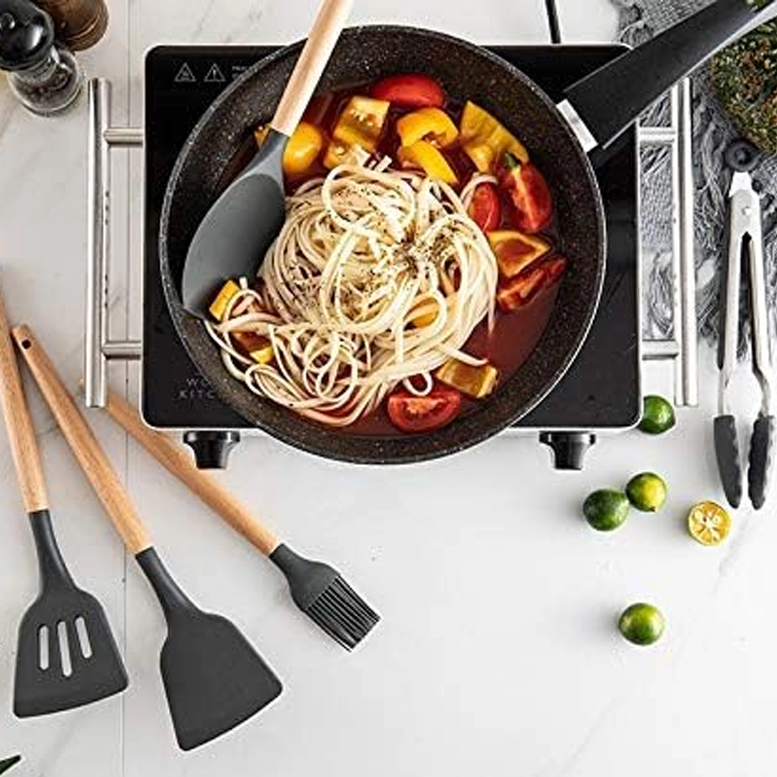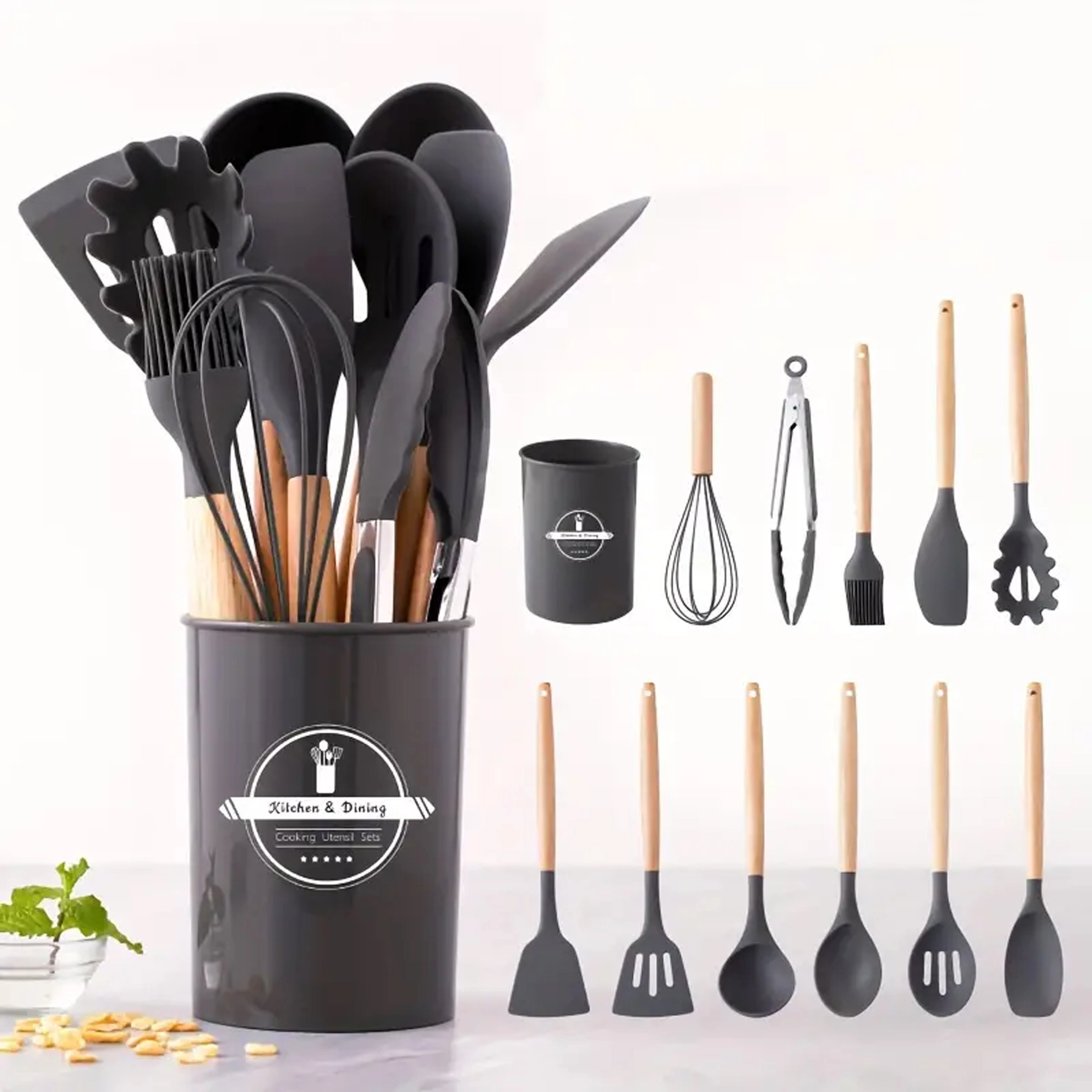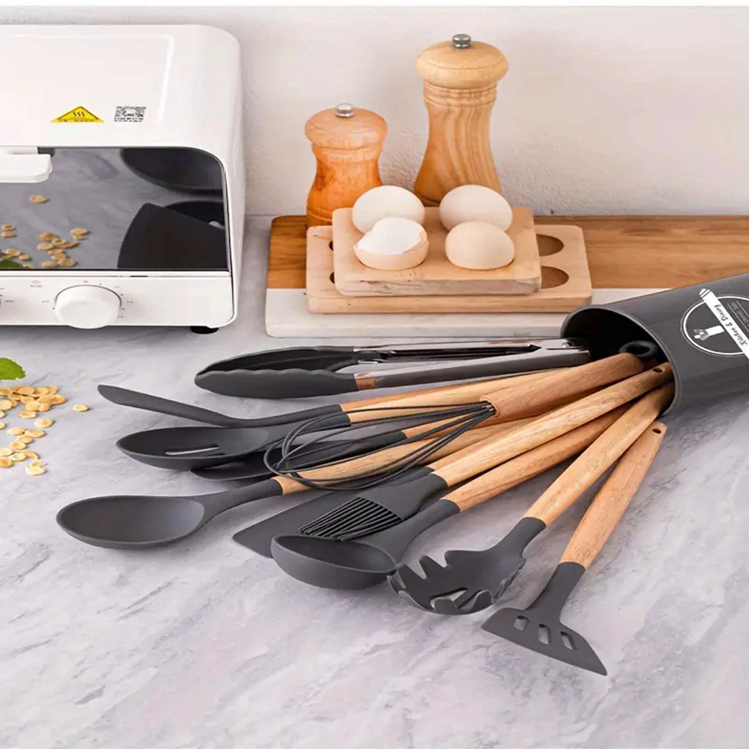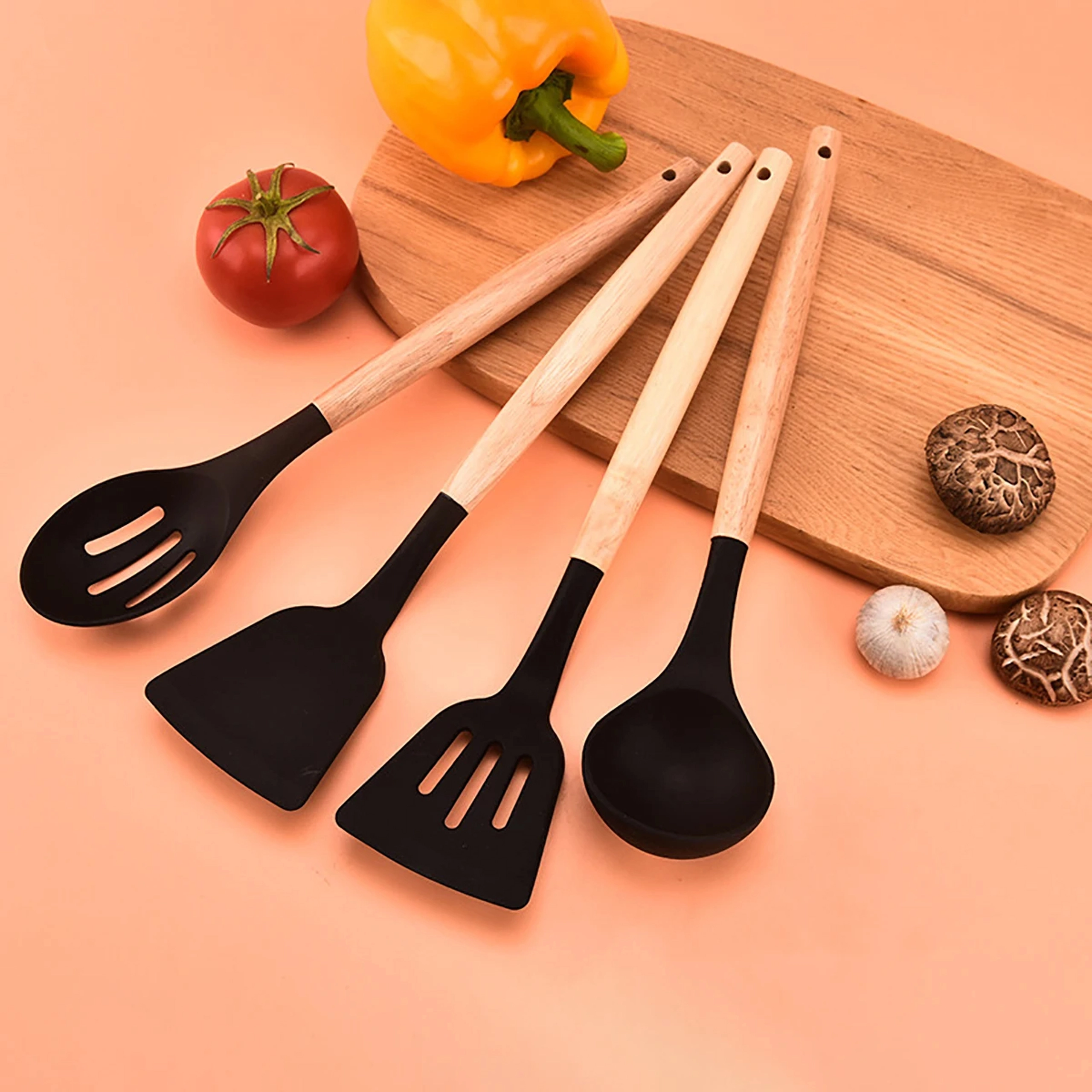 Ta vsestranski set kuhinjskih pripomočkov združuje odporen silikon s prijetnim naravnim lesom. Silikonske glave so nežne do ponev z nelepljivo površino in se preprosto čistijo, les pa zagotavlja zanesljiv in udoben oprijem. Set pokrije večino opravil pri kuhanju in peki – od mešanja omak do serviranja testenin.