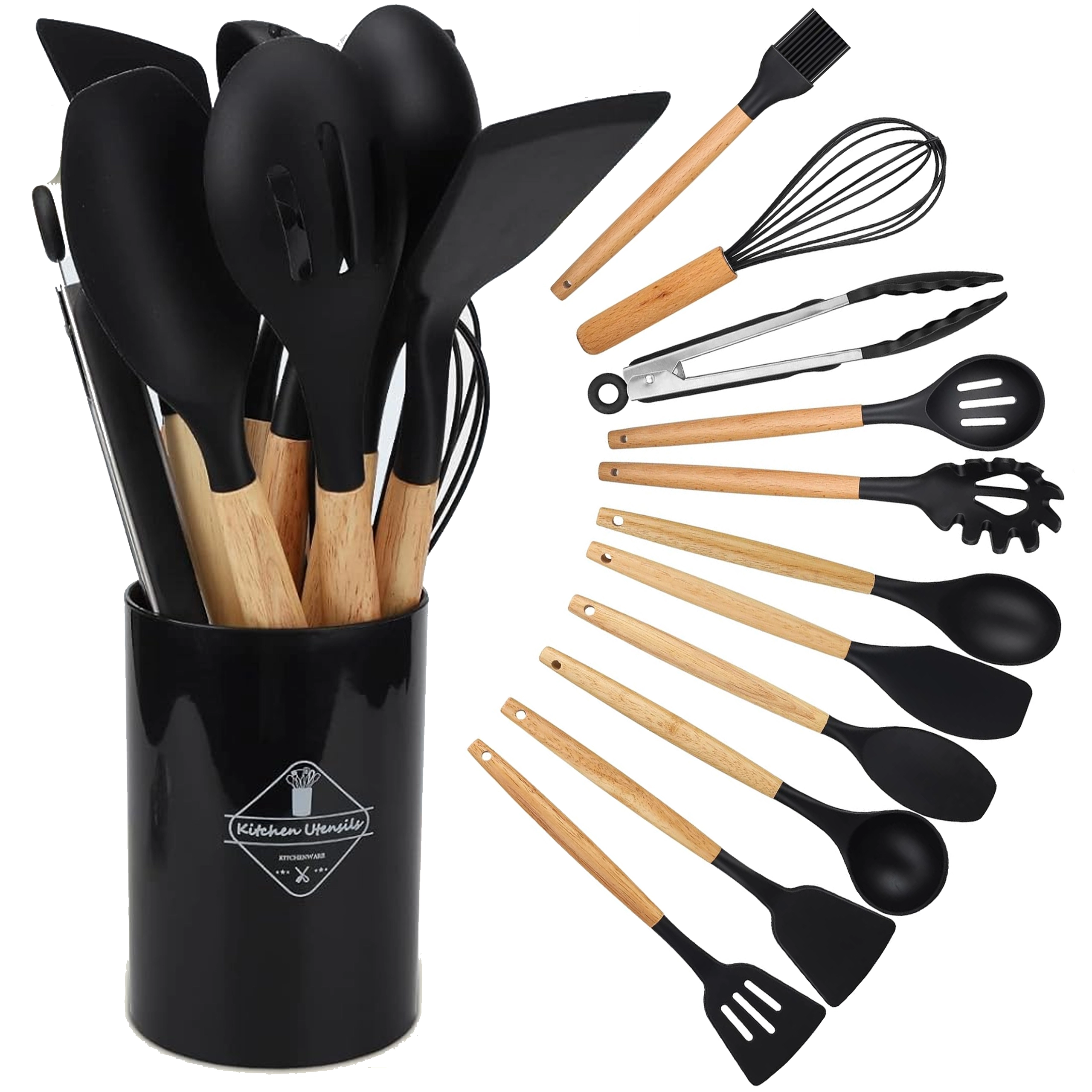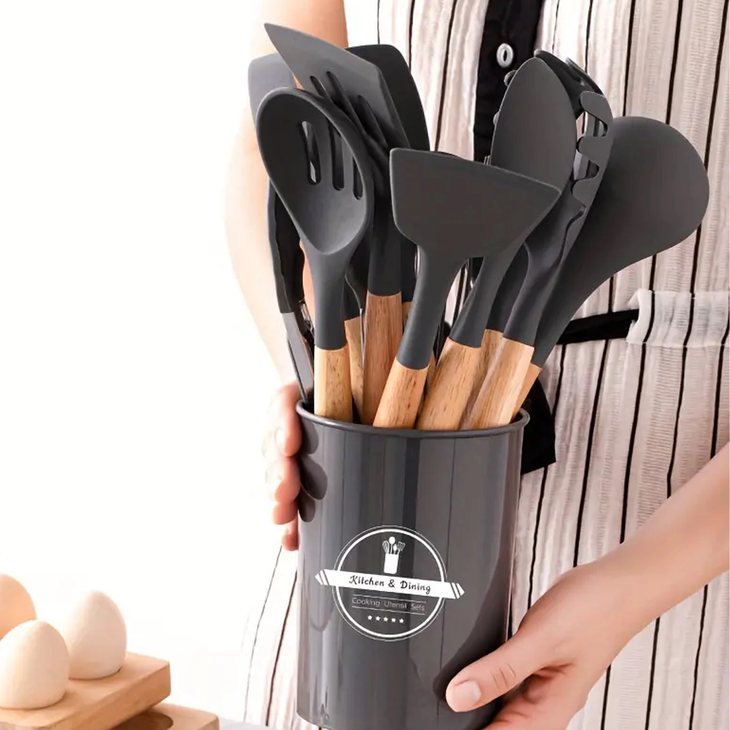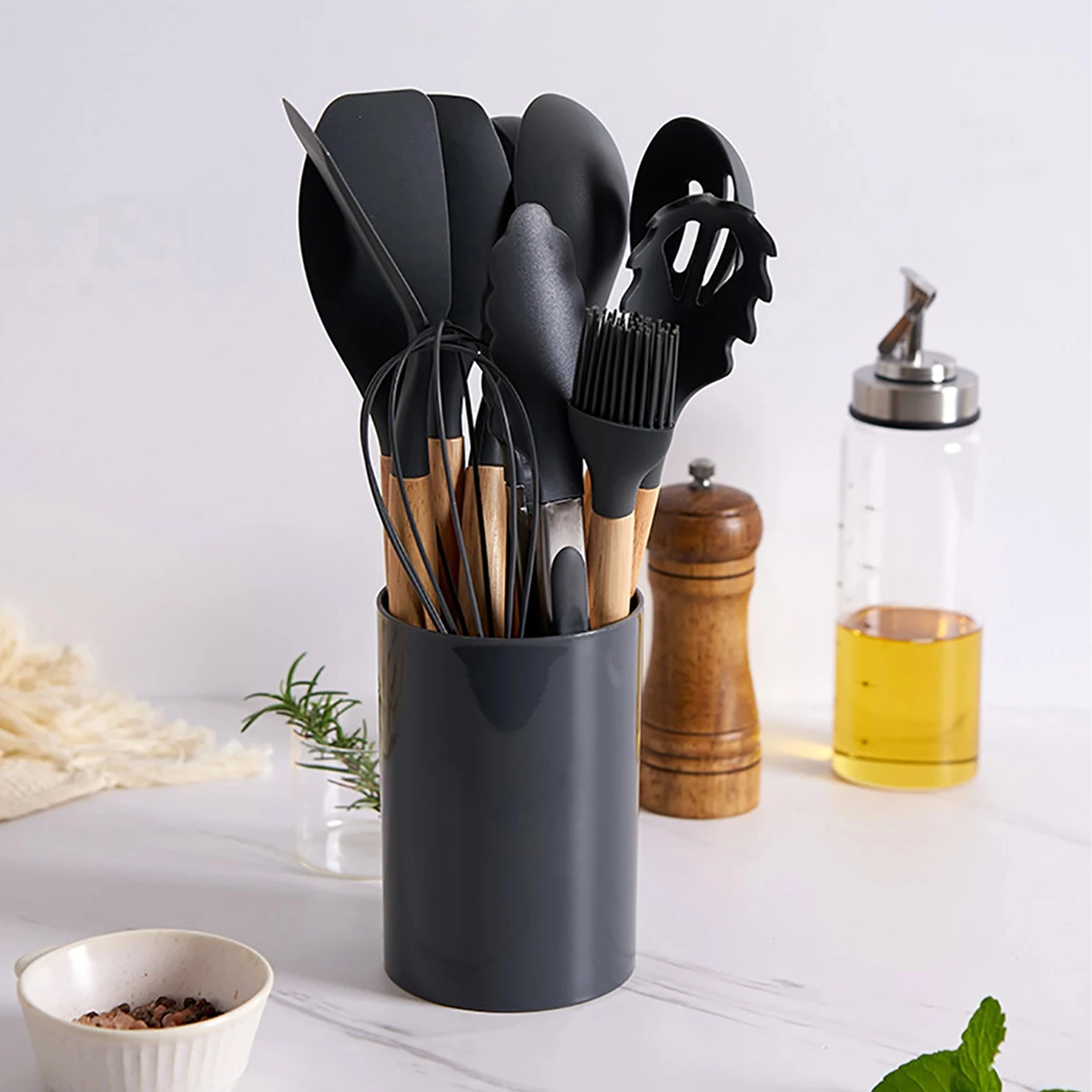 Set vsebuje lopatke, žlice, zajemalko, metlico, klešče, čopič, pripomoček za serviranje testenin in drugo – vse shranjeno v stojalu za hiter dostop.