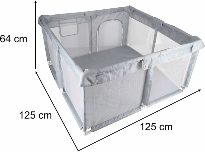 Montaža je zelo preprosta – sistem cevi in konektorjev z zapirali ter priseski drži ograjo trdno na mestu brez potrebe po orodju. Vhod na zadrgo omogoča starejšim otrokom lahkotno samostojno vstopanje. Notranja površina 120 × 120 cm zlahka sprejme igrače, kocke in suhe žogice ter pomaga ohranjati red v prostoru.