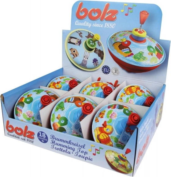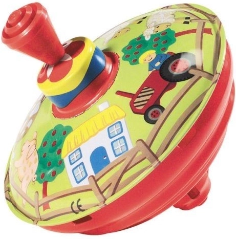 Ta tradicionalna glasbena vrtavka z motivom kmečkega dvorišča je idealna igrača za najmlajše. Preprost mehanizem s pritiskom na ročico zavrti vrtavko, ki med vrtenjem poskrbi za značilen zvok in vizualne dražljaje.