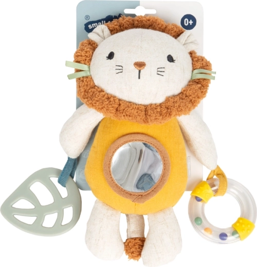 Mehki levček izstopa z mušelinsko in plišasto površino, prijetno na dotik in kot nalašč za crkljanje. Vgrajena ropotuljica z bunkicami, majhno varno ogledalce na trebuščku in mehko grizalo dojenčkom ponujajo pestre dražljaje za vid, sluh in tip. Z visečim klipom levčka zlahka pritrdite na voziček, posteljico, avtosedež ali igralni lok.
