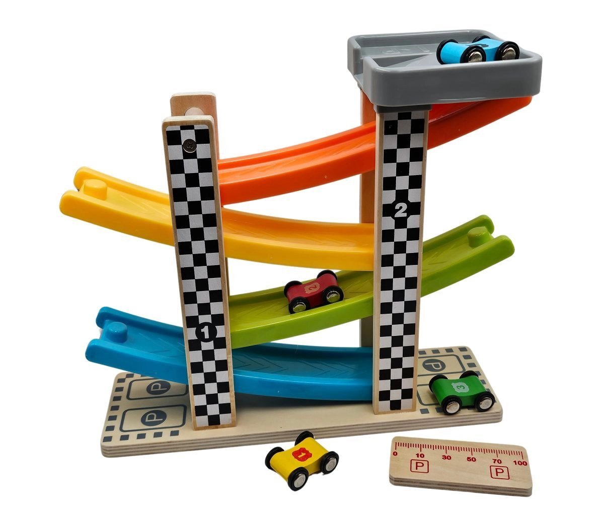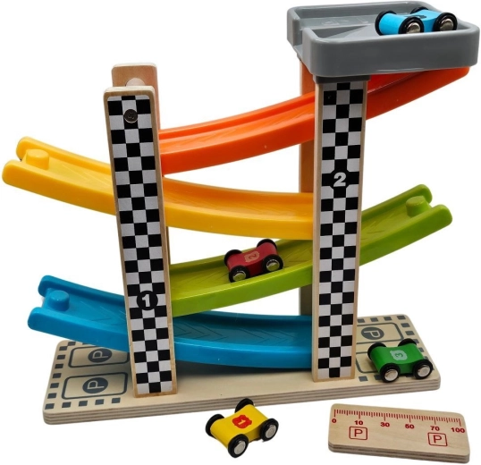 V paketu najdete vse potrebno – stabilno stezo in štiri avtomobilčke, s katerimi lahko otroci takoj zapeljejo na progo. Igrača je zasnovana z poudarkom na enostavnem upravljanju in varnosti.