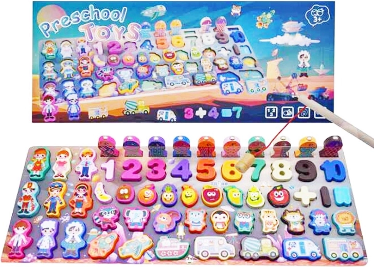 Zabavna in hkrati izobraževalna lesena igra dimenzij 45 × 18 cm spodbuja fino motoriko, zbranost ter spoznavanje števil, poklicev, živalic in sadja. V kompletu je magnetna ribiška palica in barvite ribice s številkami, prav tako pa vstavljive figurice poklicev, živalice in sadeži. Primerna je tudi kot pripomoček za vajo angleščine. Cena velja za eno pakiranje. Ni primerno za otroke, mlajše od 3 let.