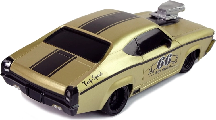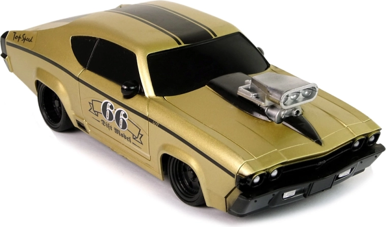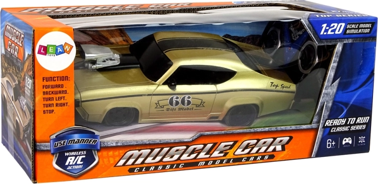 Uživajte v adrenalinski vožnji s tem zlatim RC avtom v slogu klasičnega muscle car v merilu 1:20. Ima športno zasnovo s črnimi črtami, gumijaste pnevmatike za boljši oprijem in enostavno upravljanje z priloženim daljinskim upravljalnikom. Odlična izbira za otroke in odrasle navdušence nad dirkanjem in driftom.