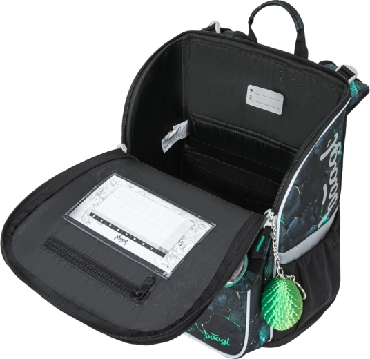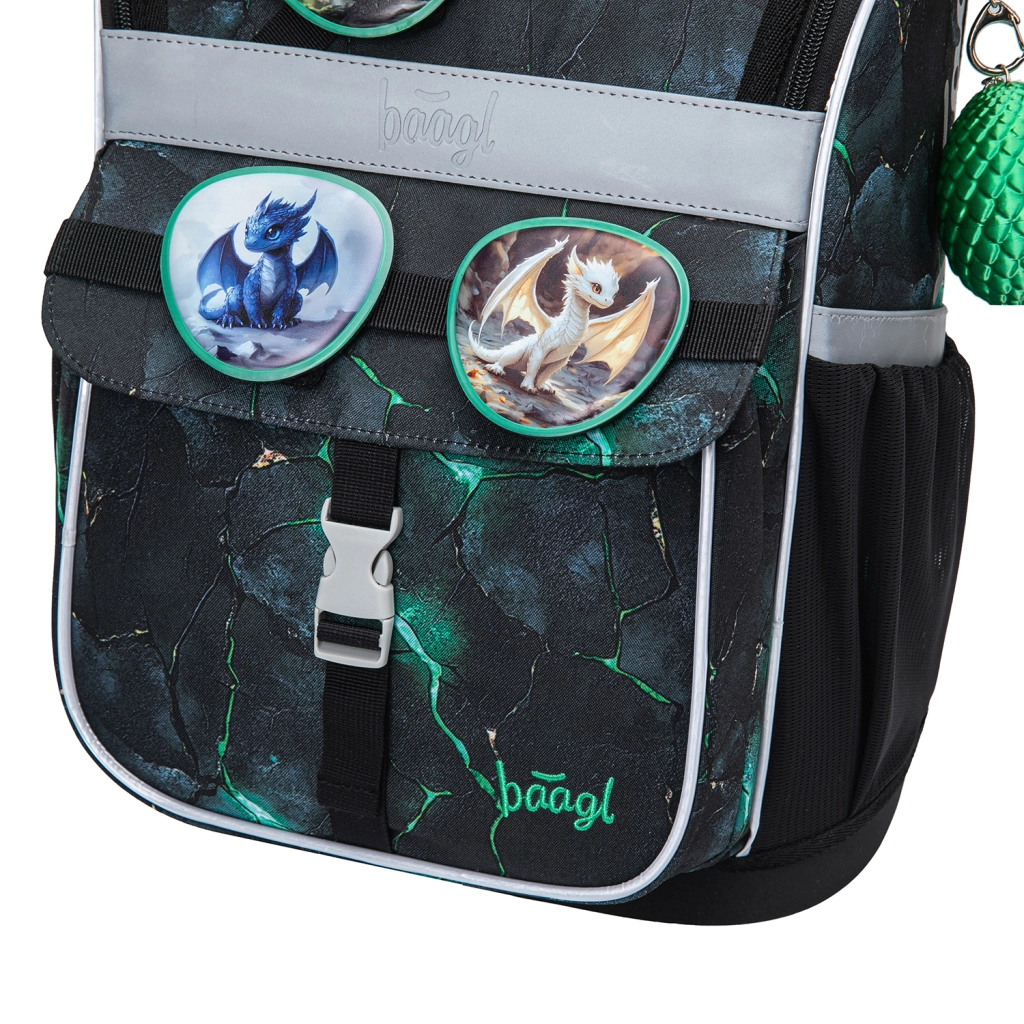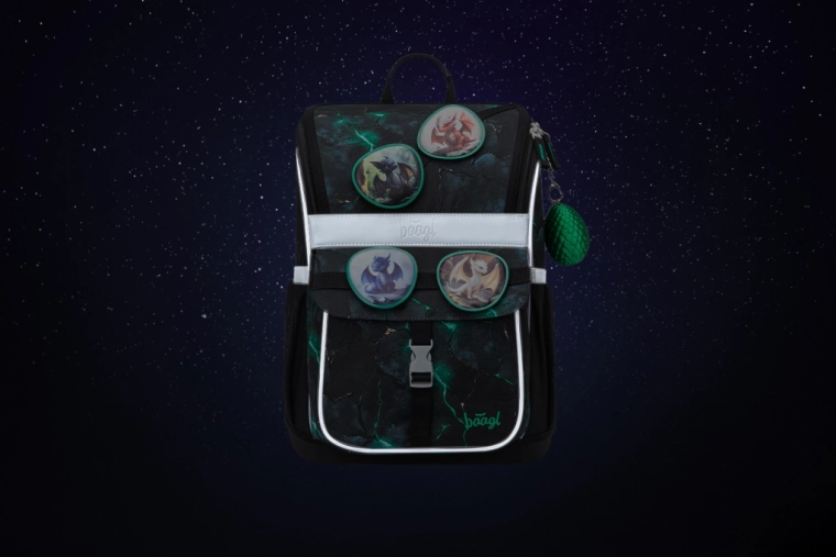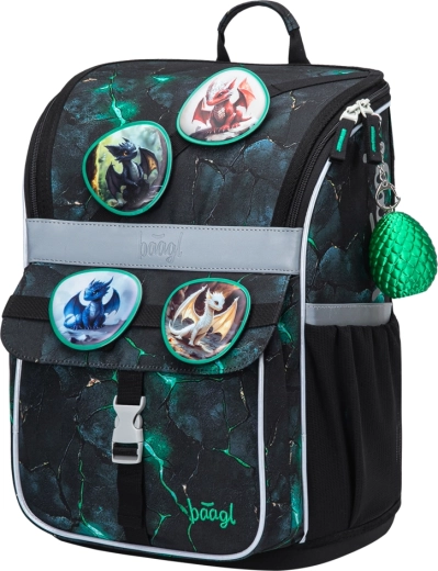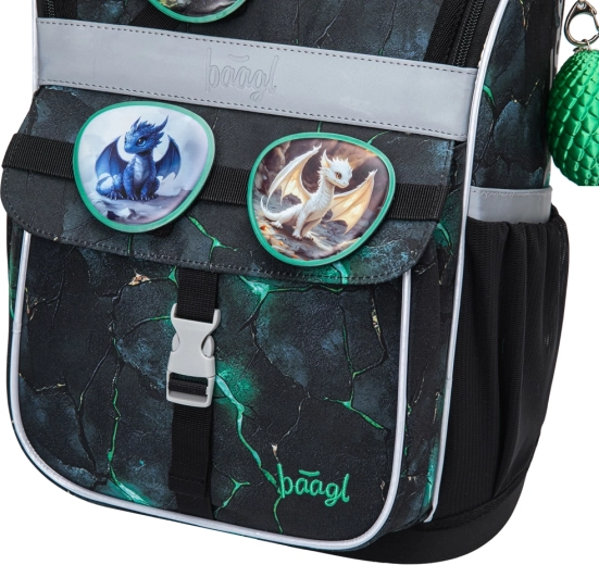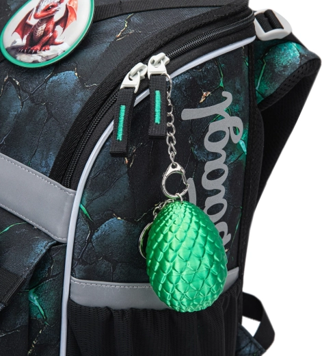Odsevni elementi za boljšo vidnost, vodoodporen material in zanesljive zadrge YKK. Zamenljivi našitki in motiv zmajev aktovki dodajo edinstven videz.