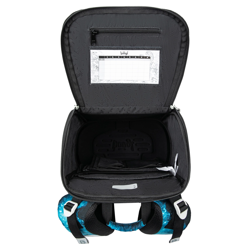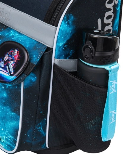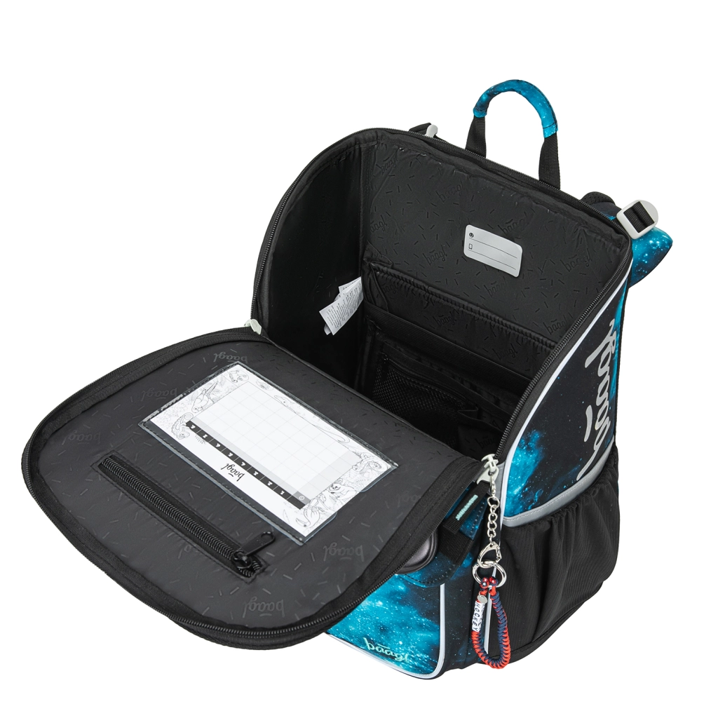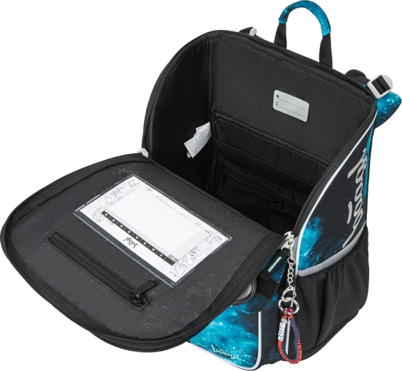 Pameten preklopni sistem odpiranja omogoča enostaven dostop do zvezkov neposredno s klopi. V notranjosti najdete pritrdilno elastiko za ohranjanje težišča blizu hrbta in pregleden razpored. Stranski žepi iz trpežnega materiala so idealni za steklenico za pijačo. Odsevni elementi povečajo varnost pri slabši vidljivosti.