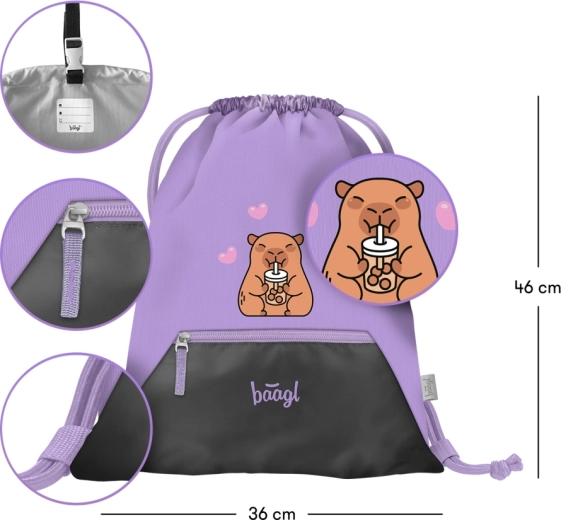 Praktičen nahrbtnik-vrečka Baagl z motivom kapibare je idealen za šolo in prosti čas. Ponuja prostorni glavni del, sprednji žep na zadrgo za drobnarije ter močne vrvice za udobno nošenje. Izdelana je iz odpornega, pralnega materiala in jo lahko zahvaljujoč zanki z zaponko preprosto pritrdite na nahrbtnik ali aktovko.