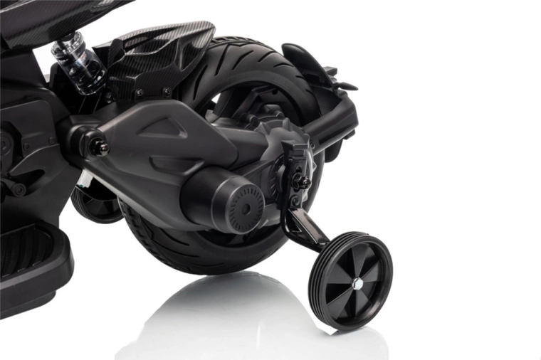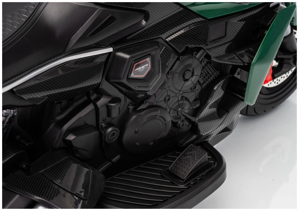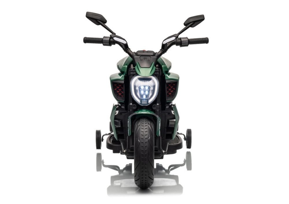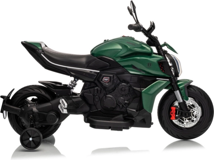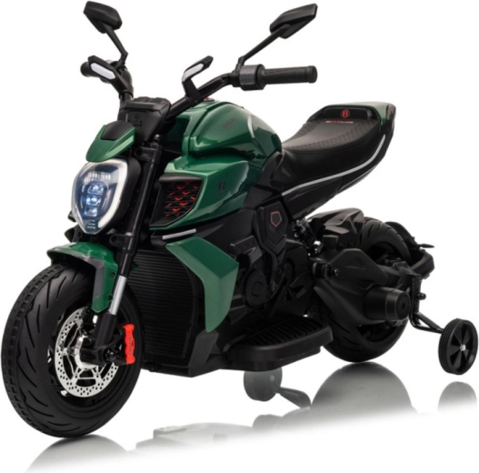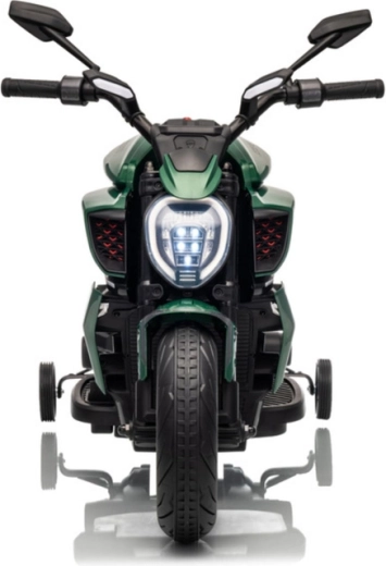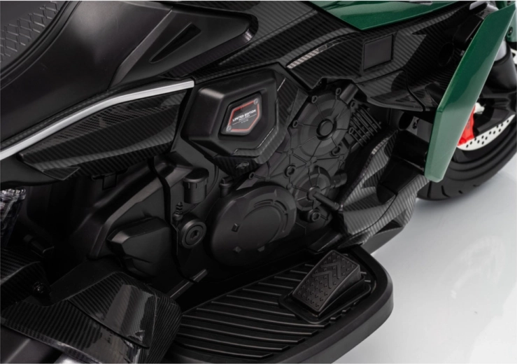 Električni otroški motor v zeleni barvi navduši s športnim videzom in varno konstrukcijo. Zaradi širokih pnevmatik in stranskih stabilizacijskih koles se otroci hitro počutijo samozavestno, medtem ko svetel LED žaromet in realistične podrobnosti (vzvratna ogledala, videz kolutnih zavor) okrepijo pravo motoristično doživetje.