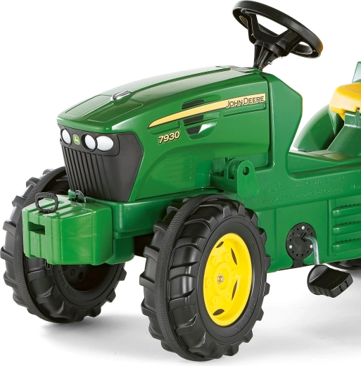Poganjalni traktor Rolly Toys v ikonični zeleno-rumeni kombinaciji JOHN DEERE je izdelan iz kakovostne, sijajne plastike, ki jo je enostavno ohranjati čisto. Zahvaljujoč verižnemu prenosu vožnjo zlahka obvlada tudi mlajši otrok, pri čemer je celoten mehanizem popolnoma zaprt za največjo varnost. Odpirajoč se pokrov in realistični detajli spodbujajo domišljijo in igro na kmetijo.