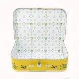 Kovček je opremljen z kovinsko sponko in močnim ročajem, kar omogoča enostavno prenašanje in varno zapiranje.