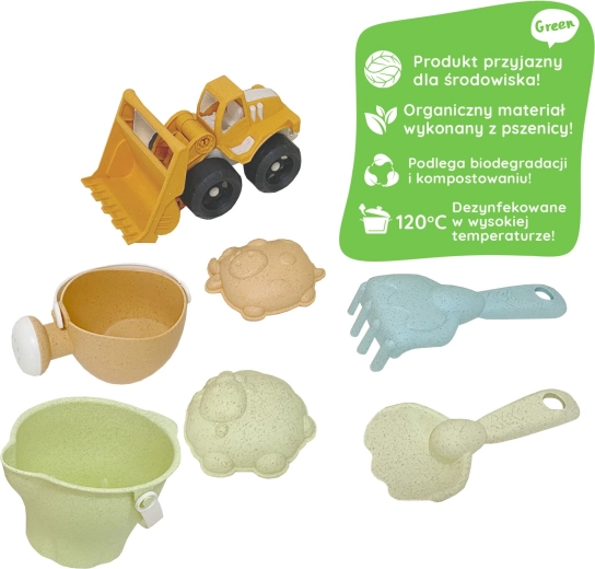 Komplet za pesek WOOPIE GREEN je zasnovan za zabavo in trajnost. Deli so razkuženi pri 120 °C, zato so varni za otroke, hkrati pa izdelani iz organskega materiala na osnovi pšenice, ki se v zemlji naravno razgradi. Pastelni dizajn navduši otroke in starše ter spodbuja ustvarjalno gradnjo gradov, oblikovanje in prevažanje peska z vozilcem.