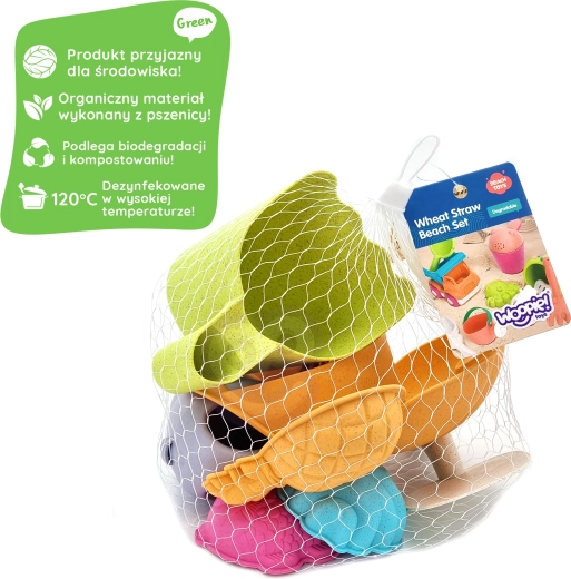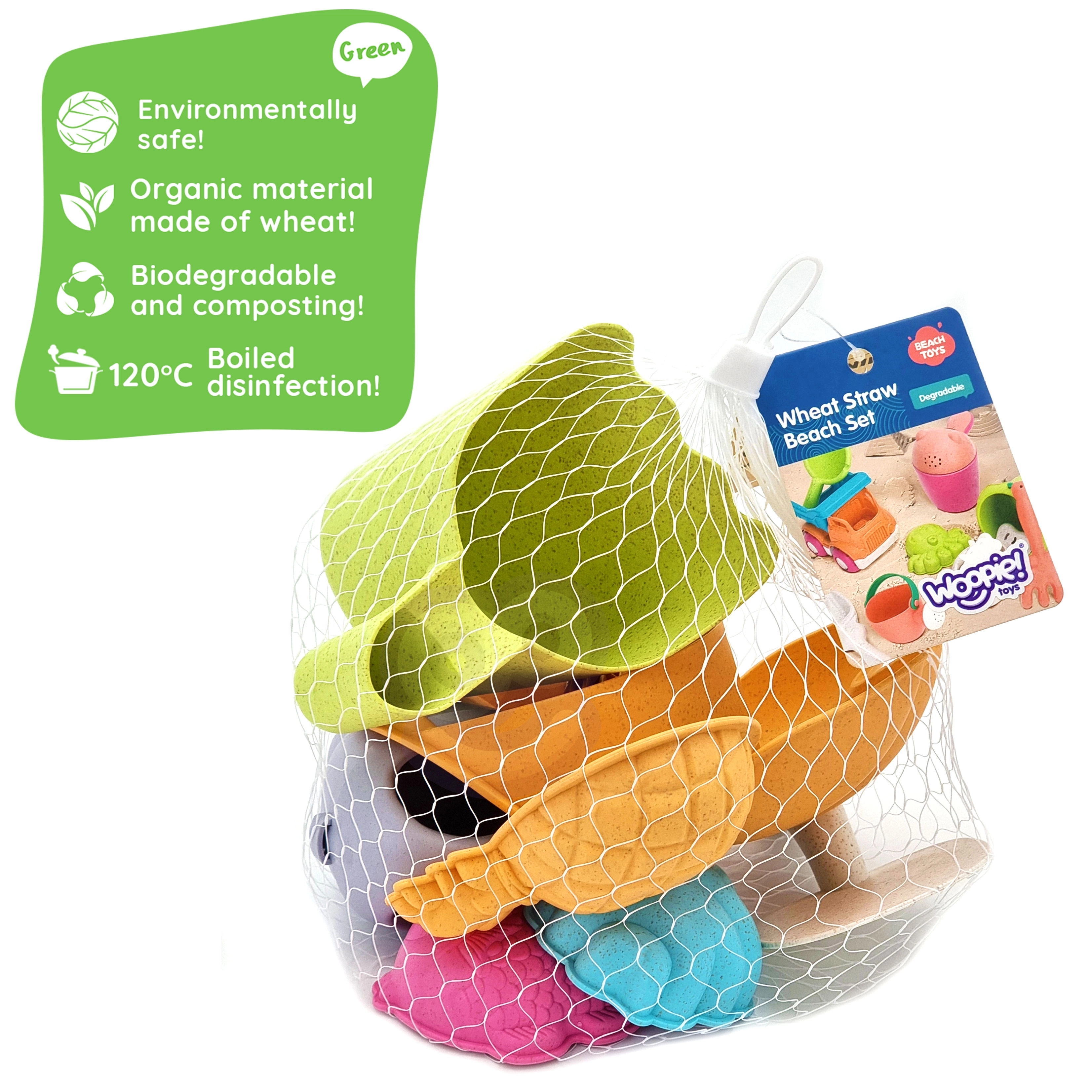 S tem kakovostnim kompletom za pesek znamke WOOPIE bodo otroci uživali v urah ustvarjalne zabave kjerkoli na prostem. Organski material na osnovi pšeničnih vlaken je prijazen do okolja, se po daljšem času v zemlji naravno razkraja in je kompostabilen. Pastelne barve delujejo moderno in prijetno, deli so lahki, trpežni in udobni za držanje tudi v manjših otroških rokah.