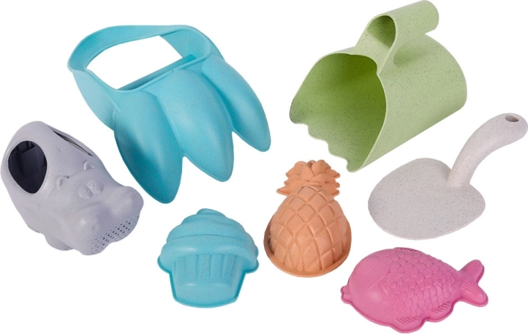 • Vsebina pakiranja: zalivalka, kremplji za pesek, velika žlica, 3 modelčki, lopatka, grabljice