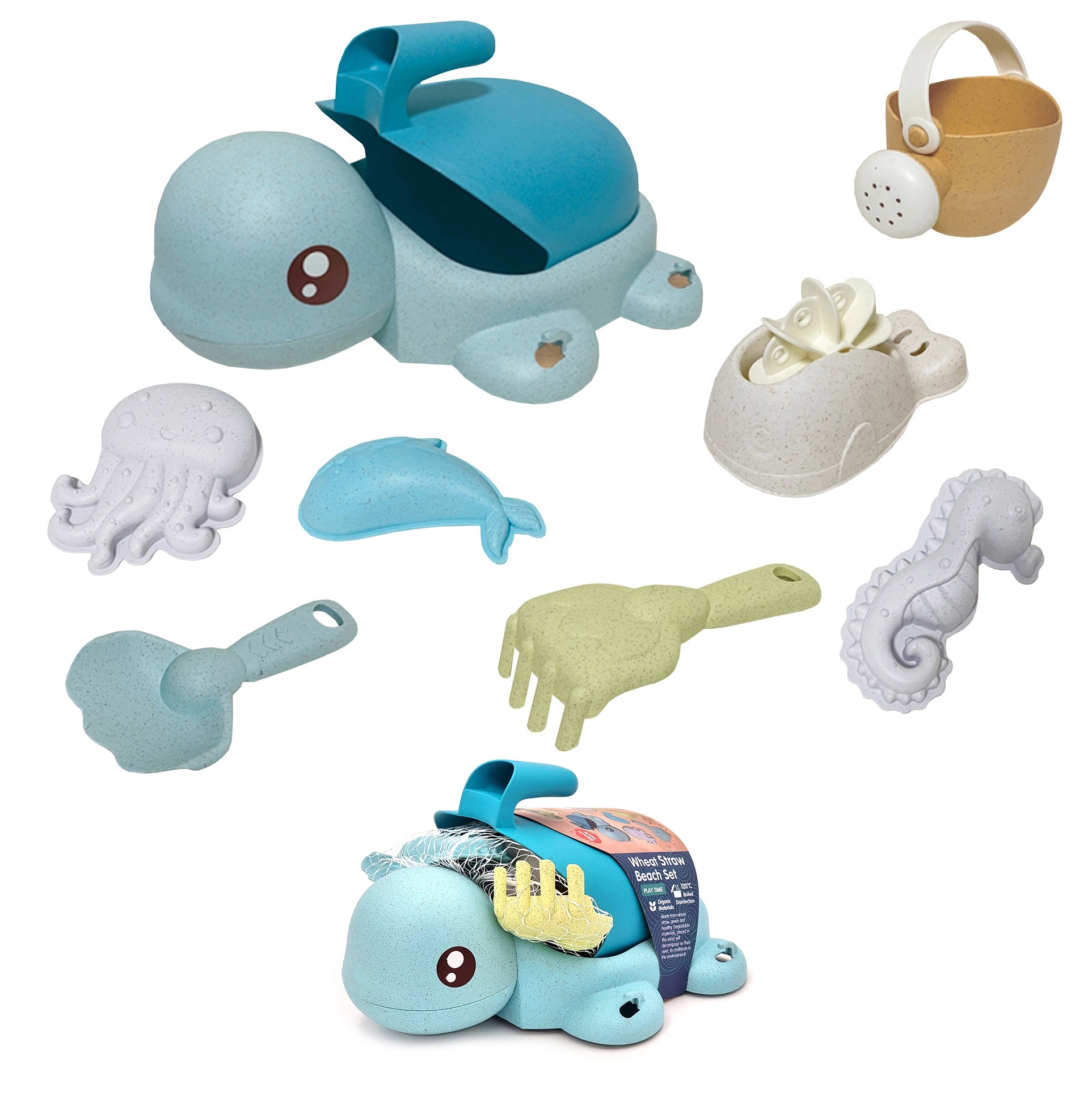 V setu najdete: vedro/želvičko z priseski, kanglico, lopatko, grabljice, žlico, kolo mlinček in 3 modelčke (morski organizmi). Pastelne barve in zaobljene oblike so prijazne tudi za mlajše otroke od 3 let. Material je biološko razgradljiv in kompostabilen, zato se otroci igrajo odgovorno do narave.