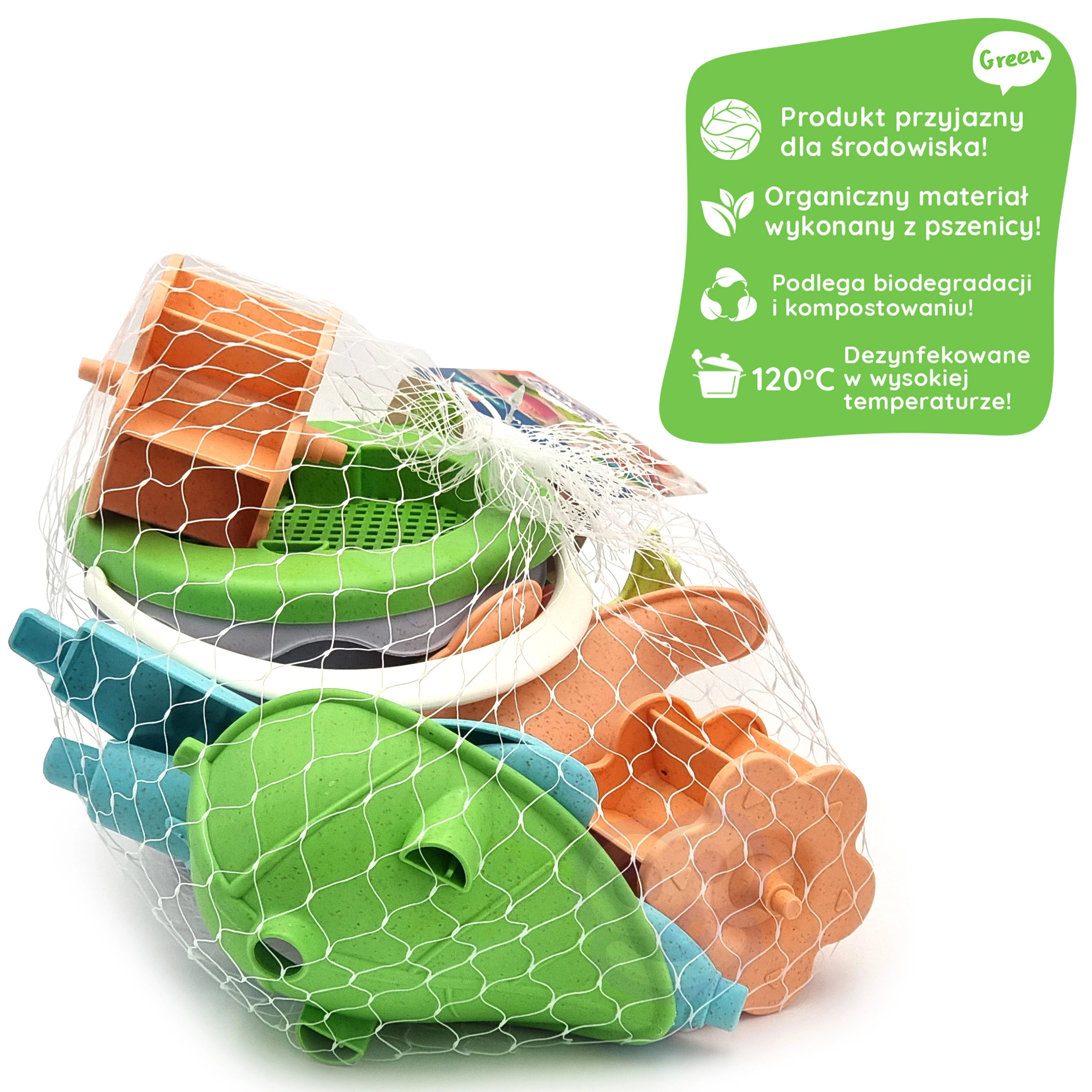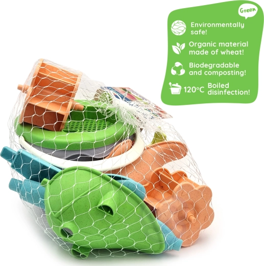 Komplet je izdelan iz organskega, biorazgradljivega materiala na rastlinski osnovi, ki je kompostljiv. Gladke oblike, vzdržljiva plastika in enostavno vzdrževanje zagotavljajo varno in dolgotrajno uporabo. Pastelne barve razveselijo otroke in starše ter se odlično ujemajo z drugimi plažnimi igračami.