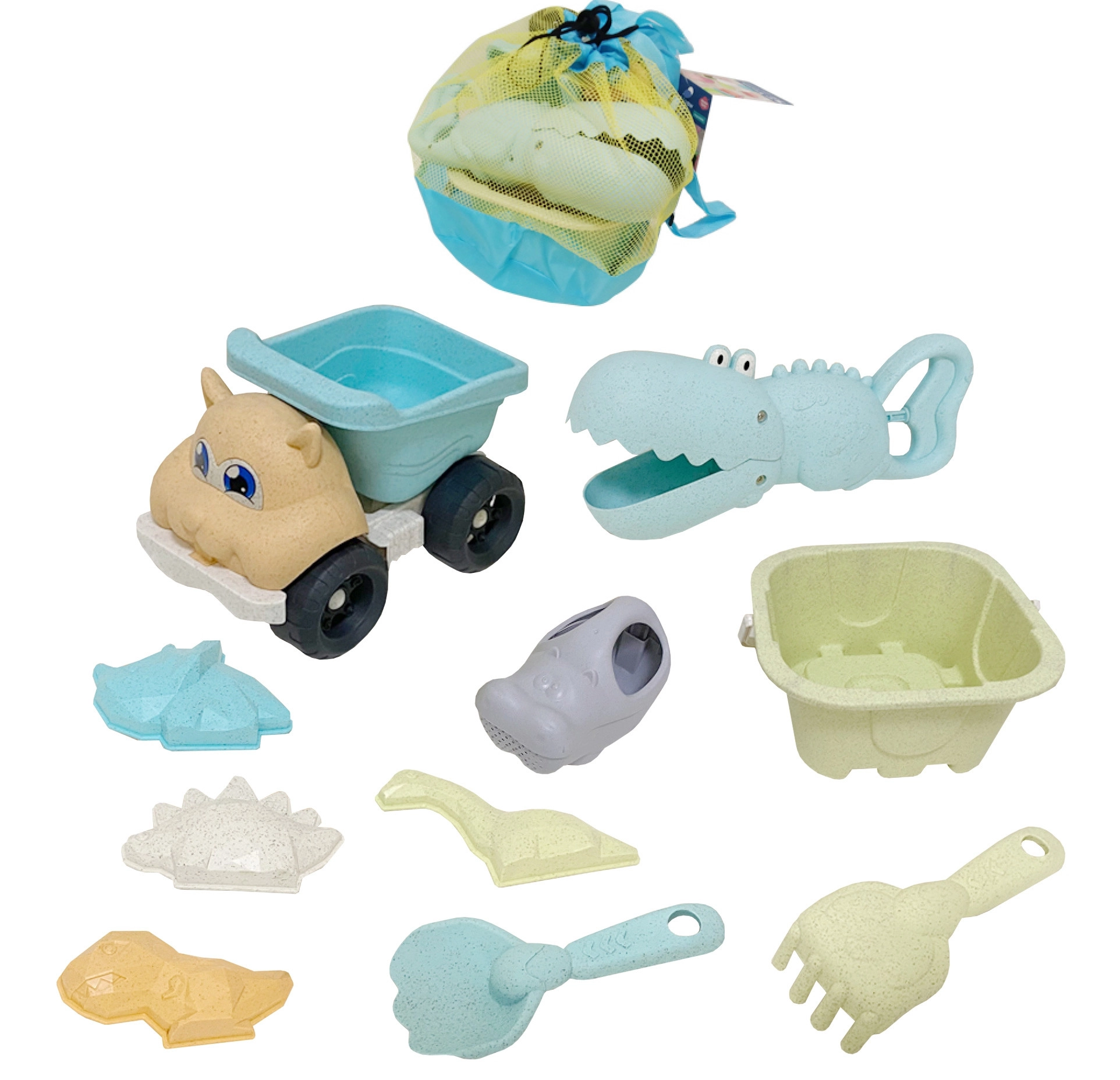 - Vedro, zalivalka, 4 modelčki, lopatka, krokodilji zajemalnik/prijemalka, grabljice, prekucni avto, mrežast nahrbtnik