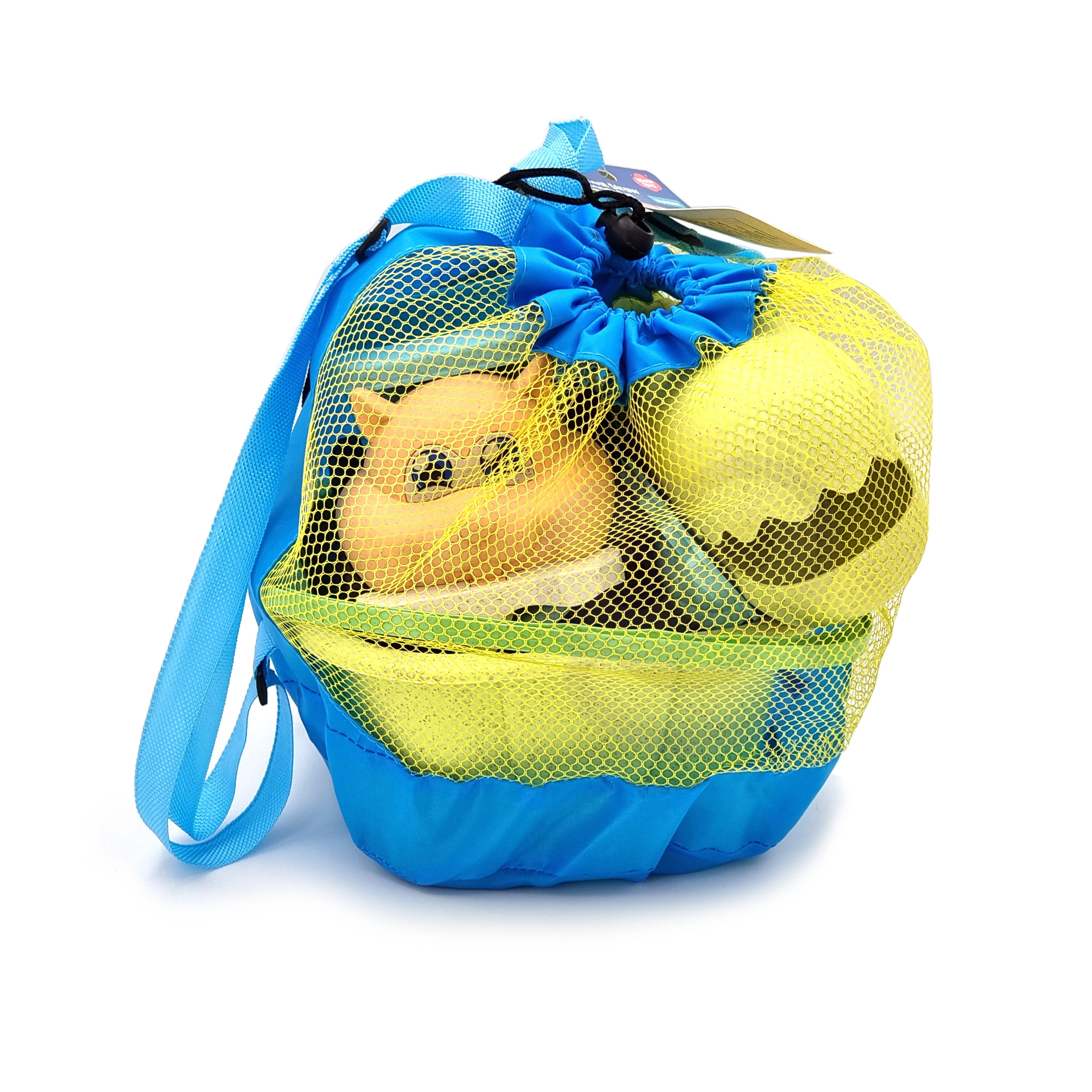 Lahka mrežasta vreča služi kot nahrbtnik – enostavno prenašanje, hitro odcejanje in sušenje igrač, manj peska v torbi po poti s plaže.