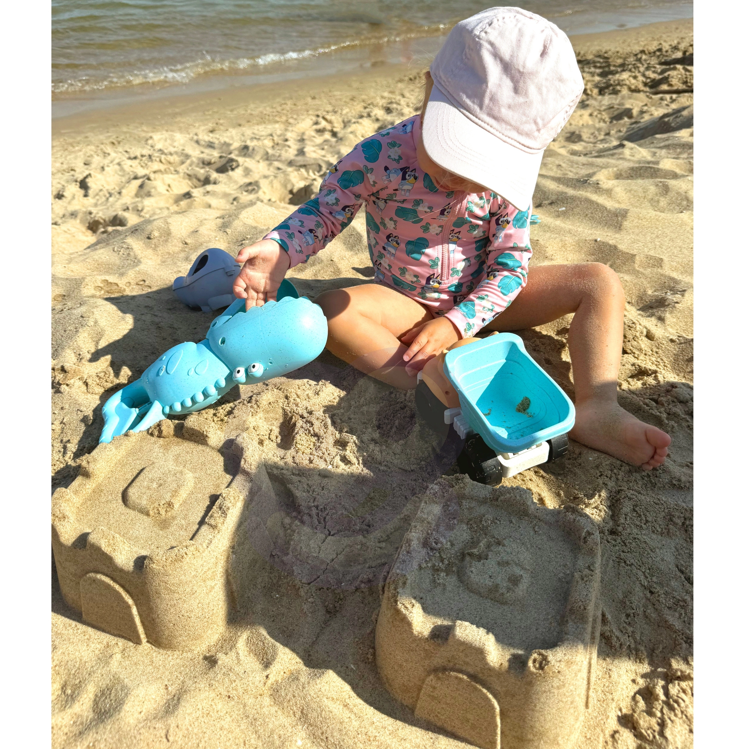 Komplet spodbuja razvoj otroške motorike, koordinacije oko–roka, domišljije in prostorskega mišljenja. Z avtomobilčkom, krokodiljim zajemalnikom in modelčki otroci gradijo gradove, presipajo pesek in prevažajo tovor. Vsi deli so lahki, s priljubljenimi oblikami živalic in prijaznimi robovi za varno igro.