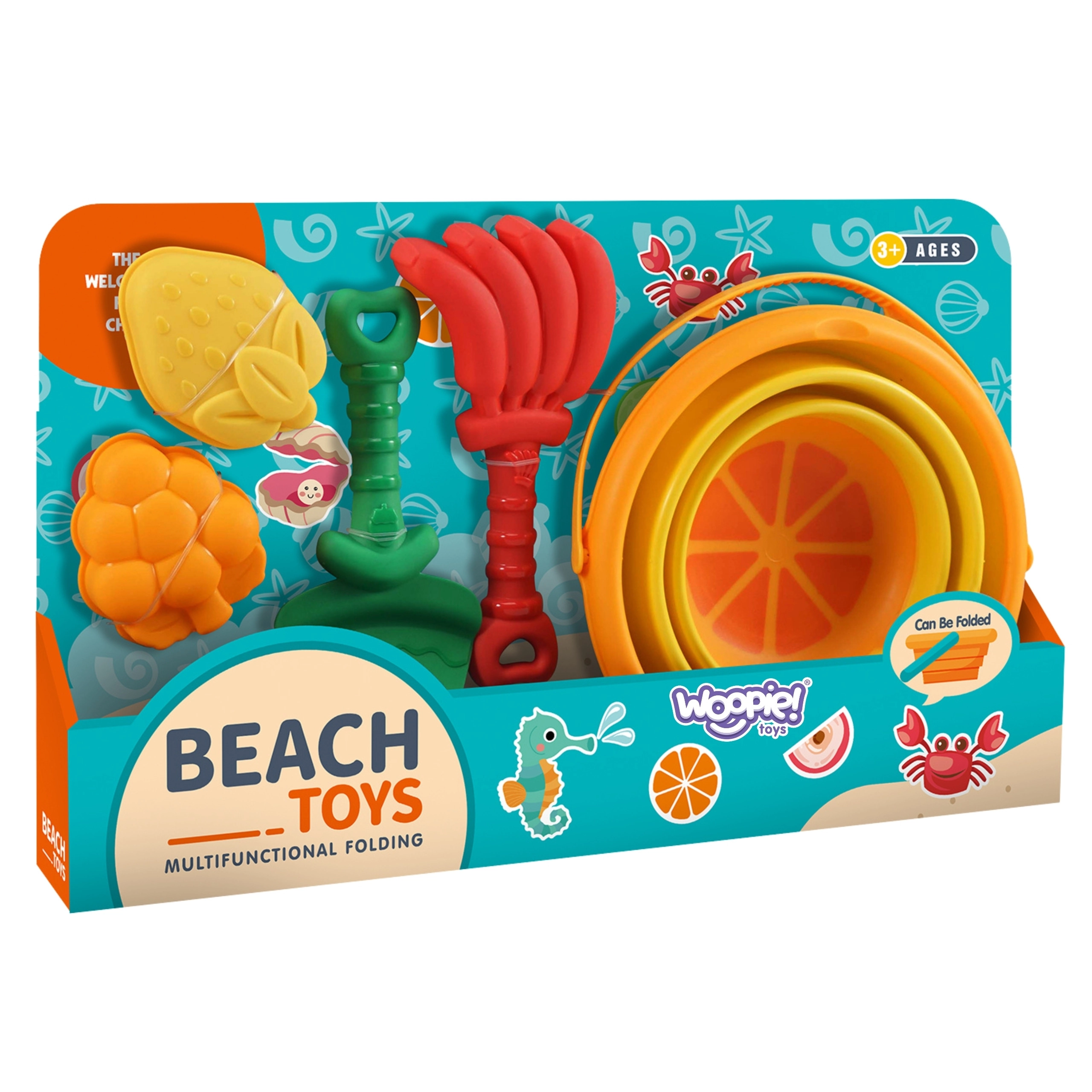 Barvit plažni komplet za pesek z motivom tropskega sadja znamke WOOPIE je idealen za otroke v peskovniku in na plaži. Ponuja kompakten dizajn, vzdržljivo in varno plastiko ter zabavne oblike orodja in modelčkov, ki spodbujajo kreativnost in fino motoriko.