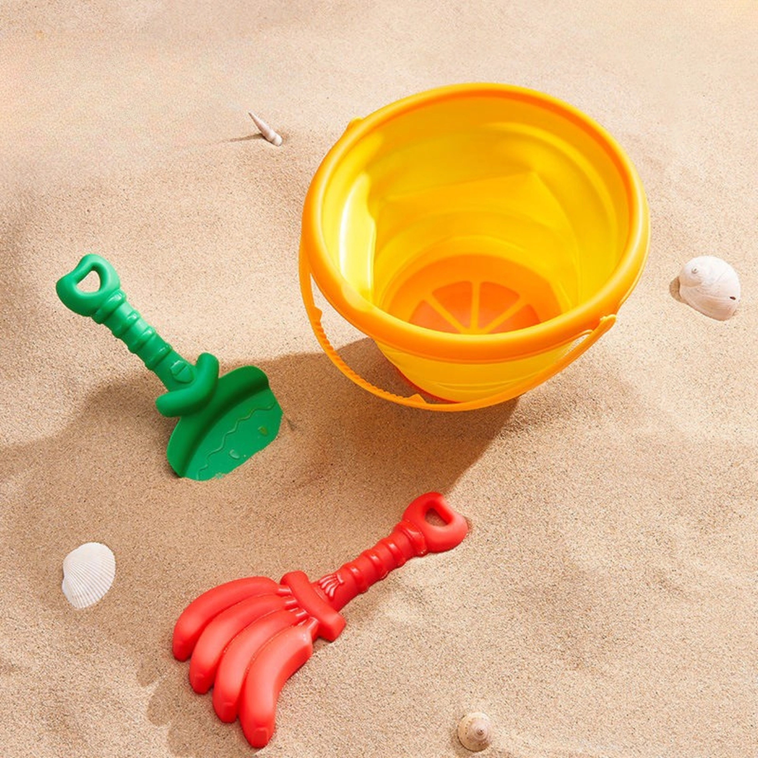 Ta vsestranski komplet za pesek združuje praktično izvedbo z zabavnim tropskim motivom. Zložljivo vedro prihrani prostor v nahrbtniku ali vozičku, lahko orodje pa dobro leži v otroških rokah. Zaradi trpežnega in varnega materiala je komplet odlična izbira za vsakodnevno igro na plaži in v peskovniku.