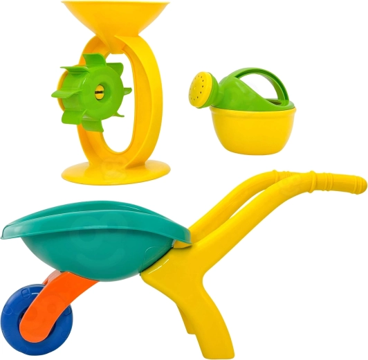 - 1× otroška samokolnica, 1× peščeni/vodni mlinček, 1× zalivalka, 1× vedro, 1× lopatica, 1× grabljice, 4× modelček