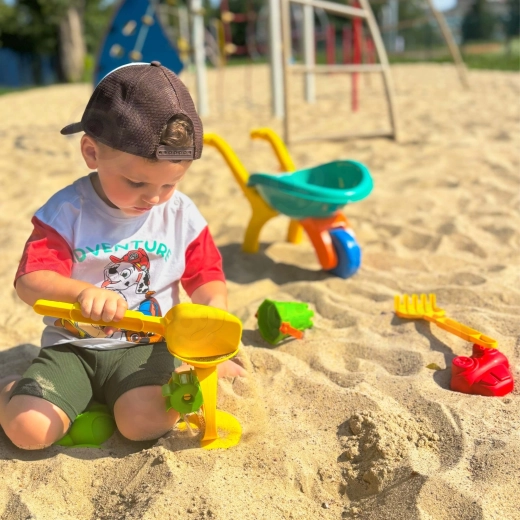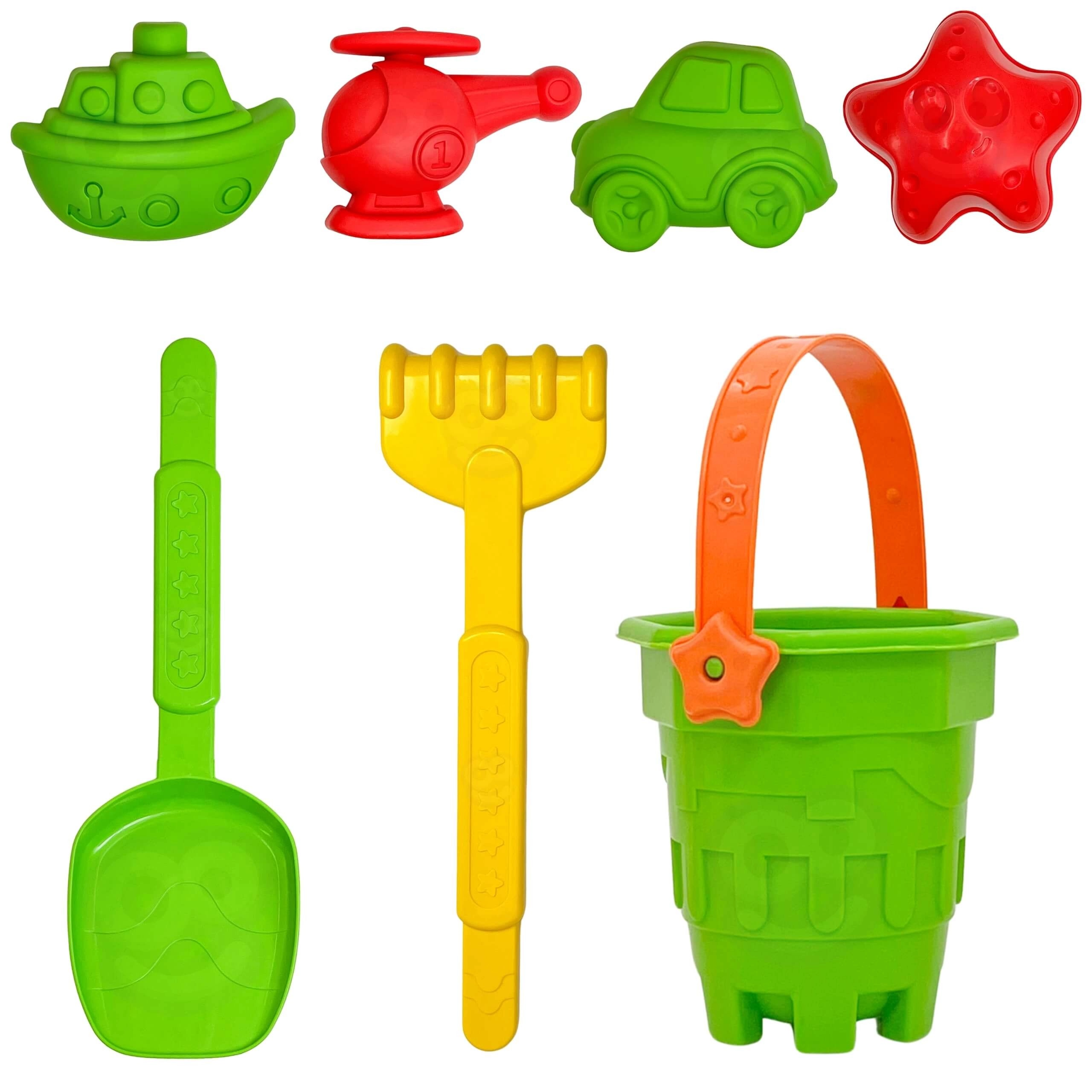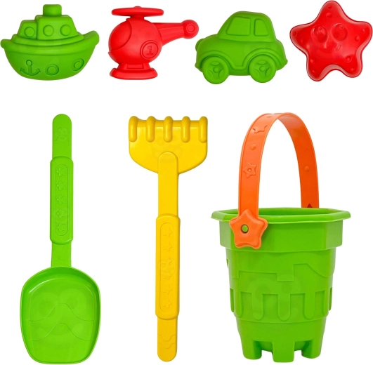 Lopatica, grabljice, vedro in 4 modelčki v obliki prevoznih sredstev ter zvezde spodbujajo ustvarjalno gradnjo in senzorično igro.