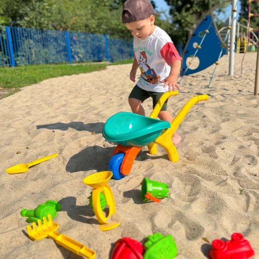 Robustna, lahka in enostavna za upravljanje, otroška samokolnica pomaga prevažati pesek, prst ali igrače ter spodbuja posnemanje resničnih opravil.