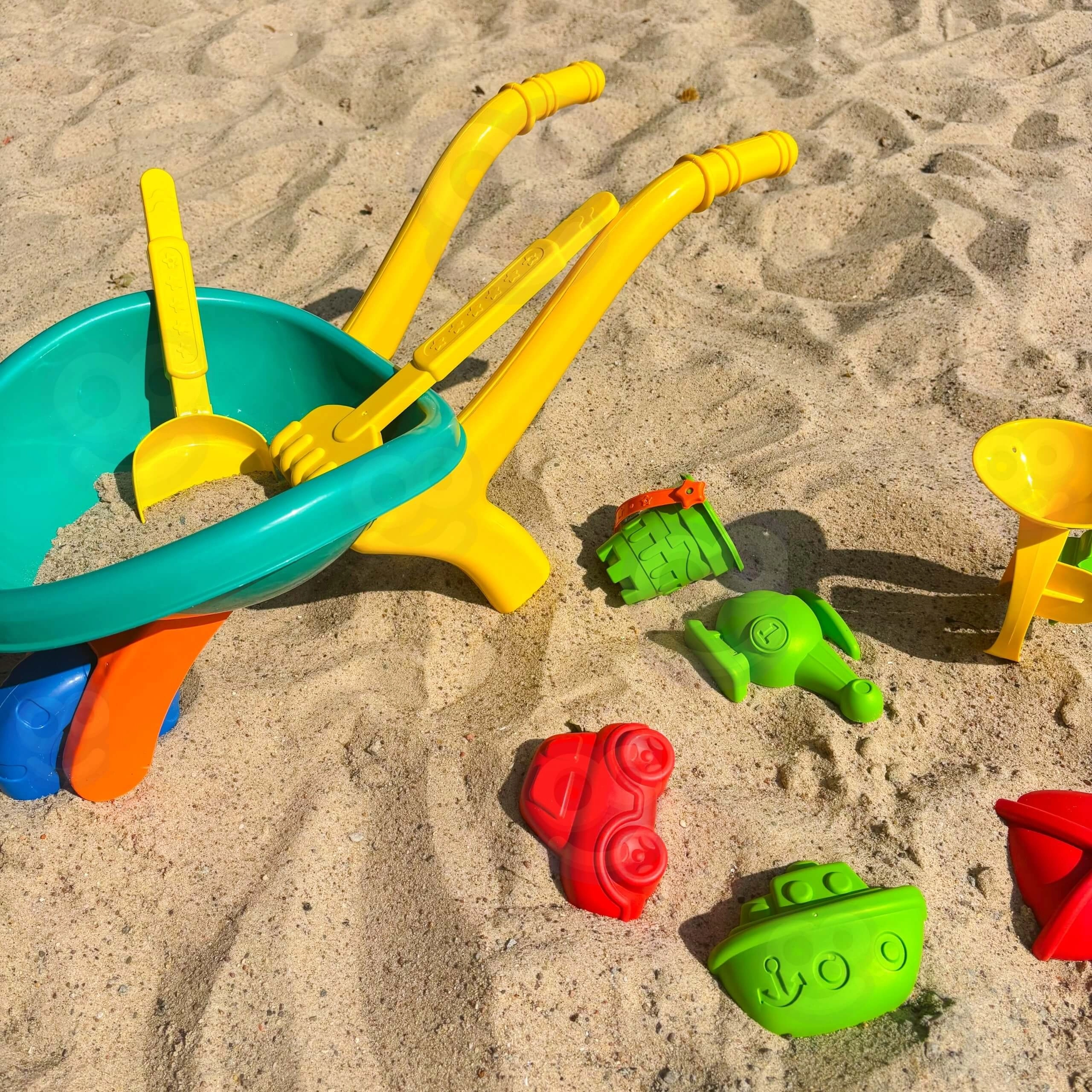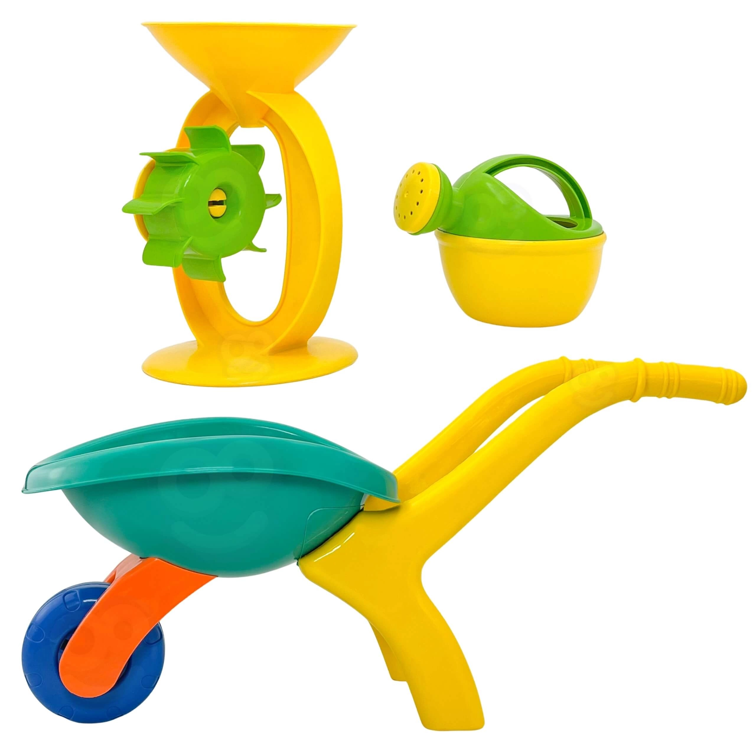 - Popolna oprema: samokolnica, mlinček, zalivalka, vedro, lopatica, grabljice in 4 modelčki.