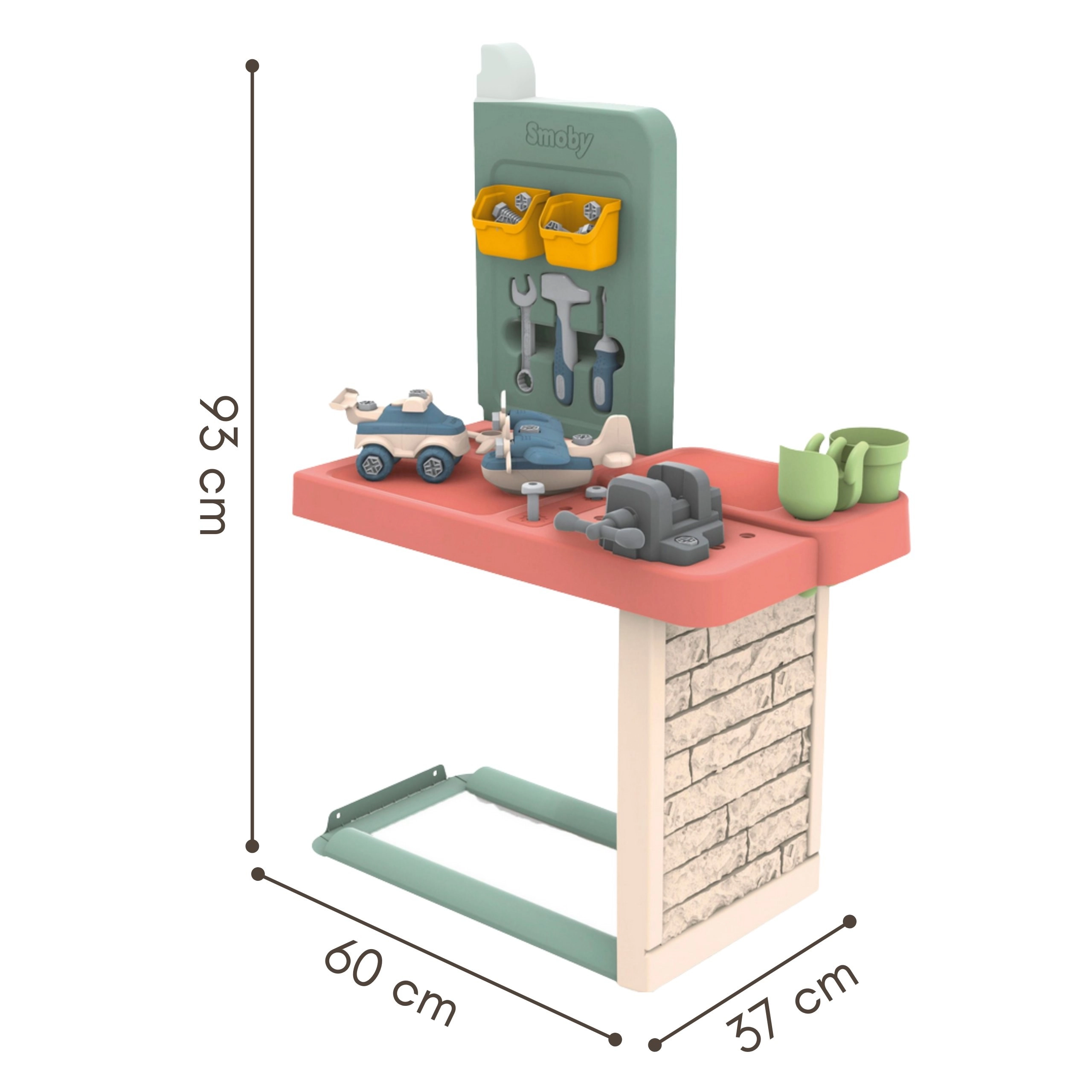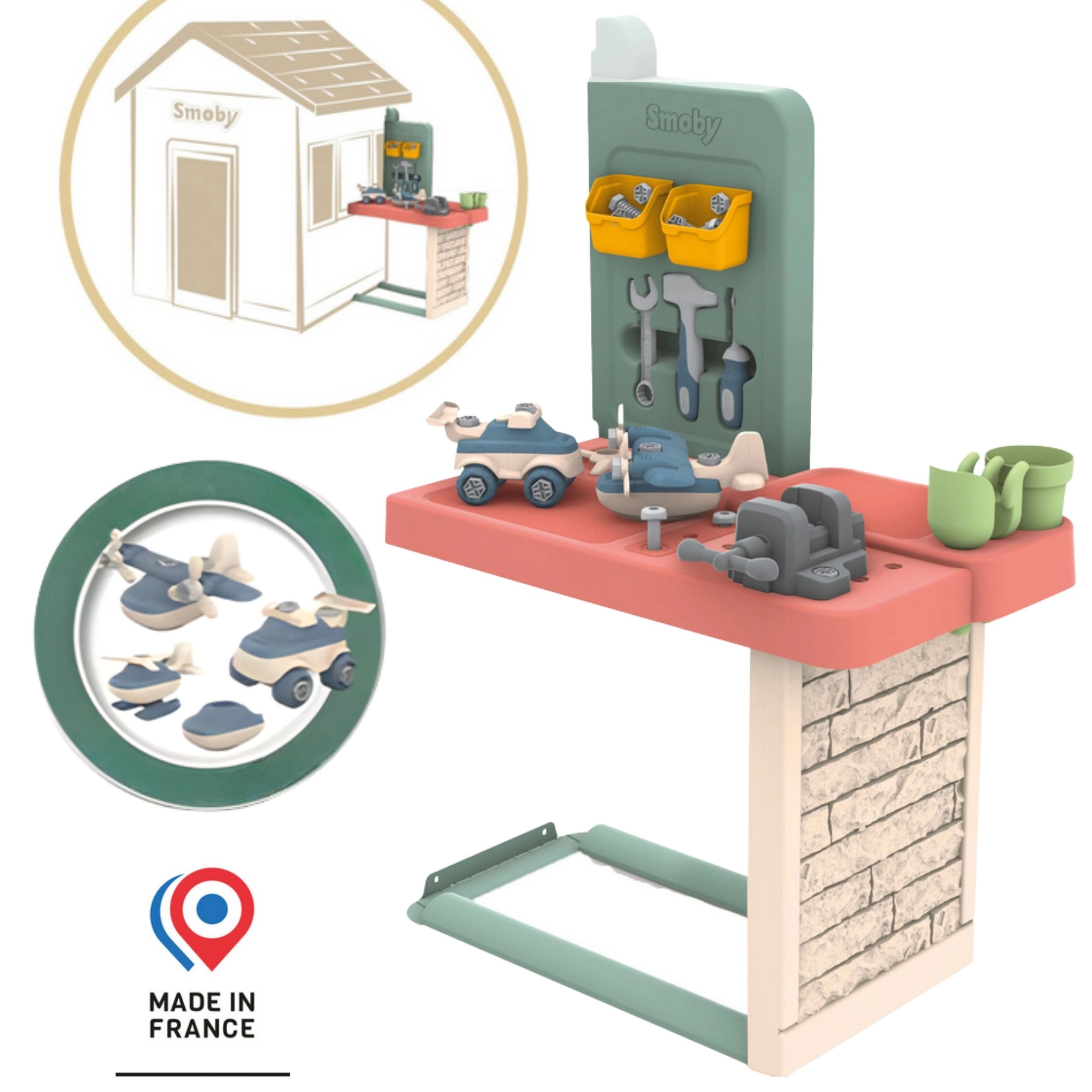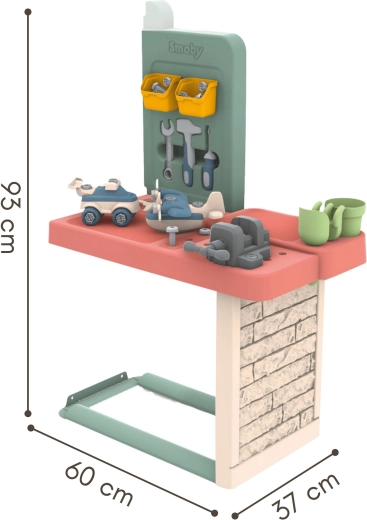 Razširite otroško hiško SMOBY Life s praktičnim delavniškim setom s priključno mizico in 39 kosi orodja ter dodatkov. Mali mojstri od 2 let bodo varno uživali v montiranju, sestavljanju in učenju novih veščin. Ne manjka prostorna delovna površina, police za shranjevanje ter modeli za sestavljanje – avto in helikopter. Konstrukcija je odporna na UV in izdelana z visokim deležem recikliranih materialov za dolgotrajno zabavo na prostem in doma.