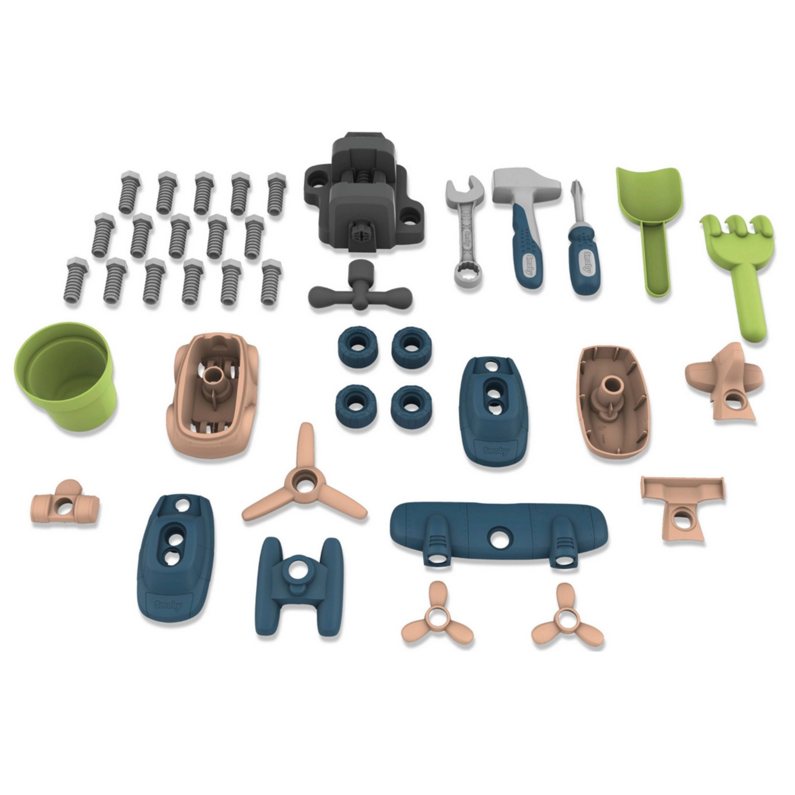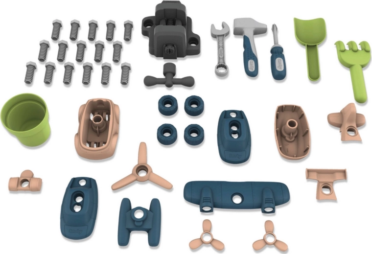 V kompletu je 39 elementov, vključno s kladivcem, izvijačem, ključi in pritrdilnim materialom. Otroci lahko sami sestavijo avto in helikopter, s čimer urijo potrpežljivost, natančnost in občutek uspeha. Material je trpežen, UV stabilen in z visokim deležem reciklata – odličen za dolgotrajno uporabo na vrtu in doma.