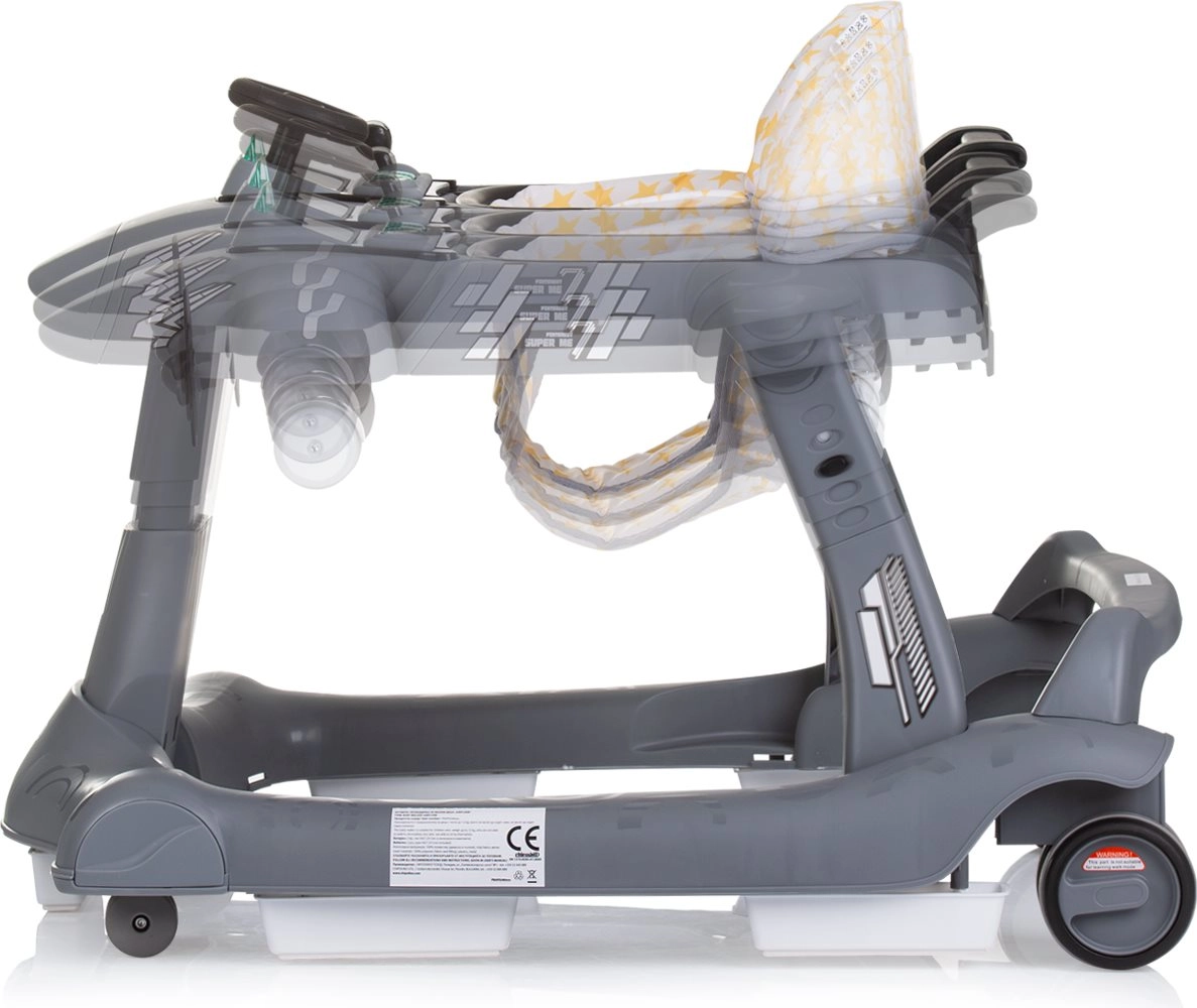 Ergonomski sedež s 3 nastavljivimi višinami raste z otrokom, medtem ko sprednja kolesca, vrtljiva za 360°, olajšajo manevriranje. Plošča z igračami in glasbo podpira vidno in slušno zaznavanje ter fino motoriko. Praktična zasnova omogoča enostavno zlaganje in kompaktno shranjevanje, materiali pa izpolnjujejo standard EN 1273 za maksimalen mir staršev.