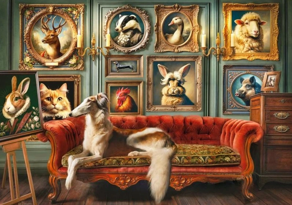 Odkrijte eleganten motiv »Aristokratski živalski svet«, ki združuje nežen humor in dovršene detajle. Sestavljanka s 1000 koščki je odlična izbira tako za začetnike kot za izkušene, ki iščejo uravnotežen izziv in kakovostno izdelavo. Po sestavi dobite sliko velikosti približno 70 × 50 cm, primerno za uokvirjanje in razstavljanje.