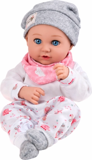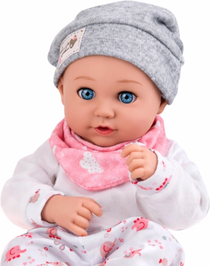 Ta skrbno izdelana punčka posnema pravega dojenčka – nežne poteze, prijazen izraz in dovršeni detajli pri otrocih vzbujajo željo po skrbi in posnemanju odraslih. Svetel pajac z diskretnim vzorcem, mehka kapica in rožnat slinček lepo usklajeno delujejo v pastelni kombinaciji.