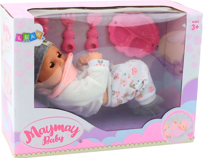 Ljubka punčka dojenček višine 28 cm s setom za hranjenje bo razveselila vsakega otroka pri negovalnih in tematskih igrah. Ima realistične poteze obraza, modre oči in je oblečena v pastelna oblačila s kapico in rožnatim slinčkom. Priloženi so praktični dodatki za hranjenje (skledica, žlička, vilica) ter igrača–rožljalo, ki spodbujajo empatijo, odgovornost in razvoj domišljije.