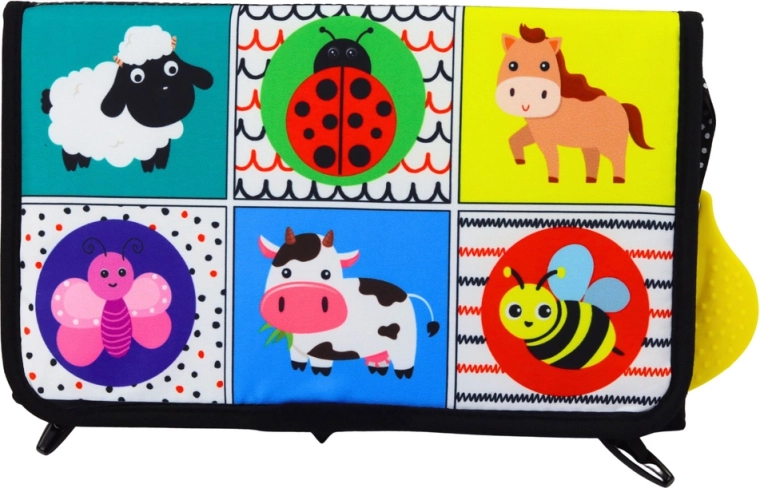 Podloga ponuja različne senzorične dražljaje – šumeče površine, viseča grizala in raznolike teksture za fino motoriko. Je mehka, lahka in enostavna za zlaganje, zato jo lahko vzamete v voziček, posteljico ali na pot. Odlična je za tummy time, igro na trebuščku in prve poskuse dvigovanja glavice.