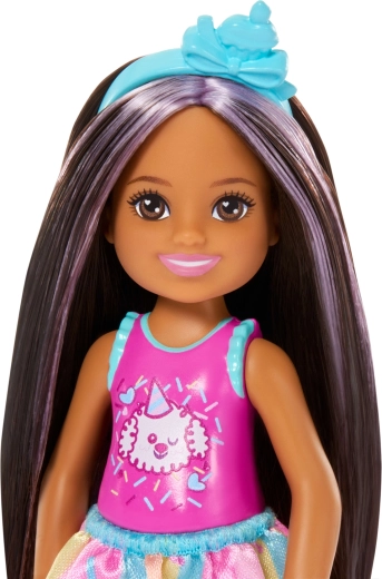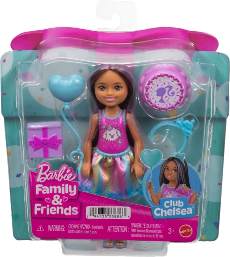 Prisrčna punčka Barbie Club Chelsea prinaša rojstnodnevno zabavo v vsako igro. Majhna punčka, visoka približno 13 cm, ima dolge temne lase z vijoličnimi prameni, nosi ljubek top s kužkom, pisano krilce in svetlo modre sandale. V kompletu so tematski dodatki za rojstnodnevno slavje – balon, darilo, naglavni trak in torta – ki spodbujajo kreativno igranje vlog in pripovedovanje lastnih zgodb.