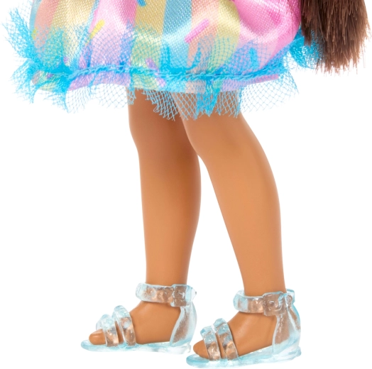 Chelsea nosi top s kužkom, večbarvno tutu krilce in svetlo modre sandale. Oblačilca so snemljiva in primerna za modno igranje.