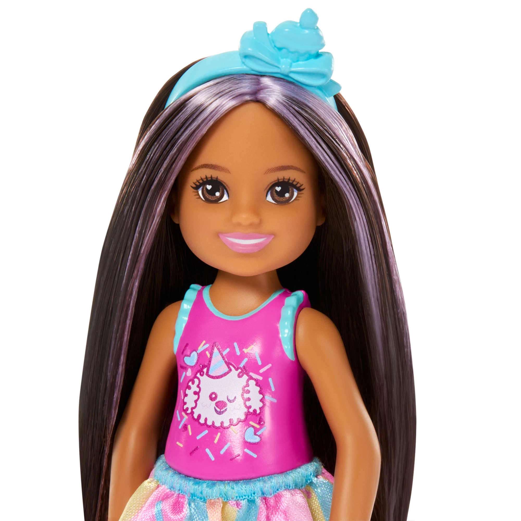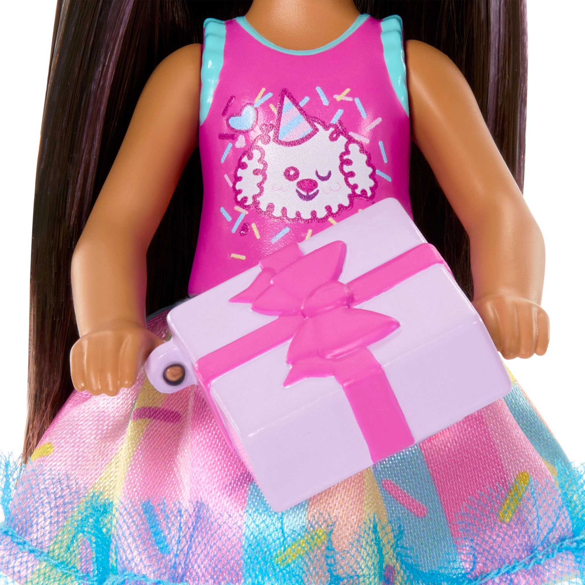 Paket vsebuje vse, kar potrebujete za popolno zabavo: naglavni trak v slogu cupcake, balon v obliki srca, darilo in rojstnodnevno torto. Oblačilca so snemljiva, zato lahko otroci uživajo v oblečenju in modnem igranju. Punčka Chelsea je odlična za zbirko in se zlahka kombinira z drugimi izdelki BARBIE.