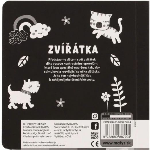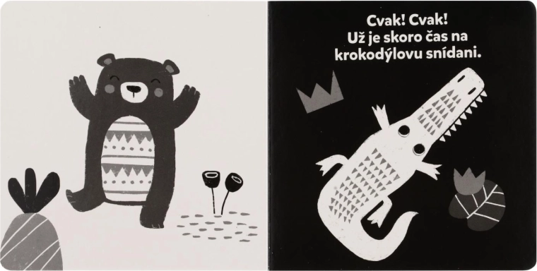 Odkrijte prve knjige za najmlajše: visokokontrastno kartonko z živalicami v formatu 16 × 16 cm, idealno od 0 mesecev. Kontrastne črno-bele ilustracije podpirajo vidno stimulacijo, razvoj pozornosti in prvo zaznavanje oblik.
