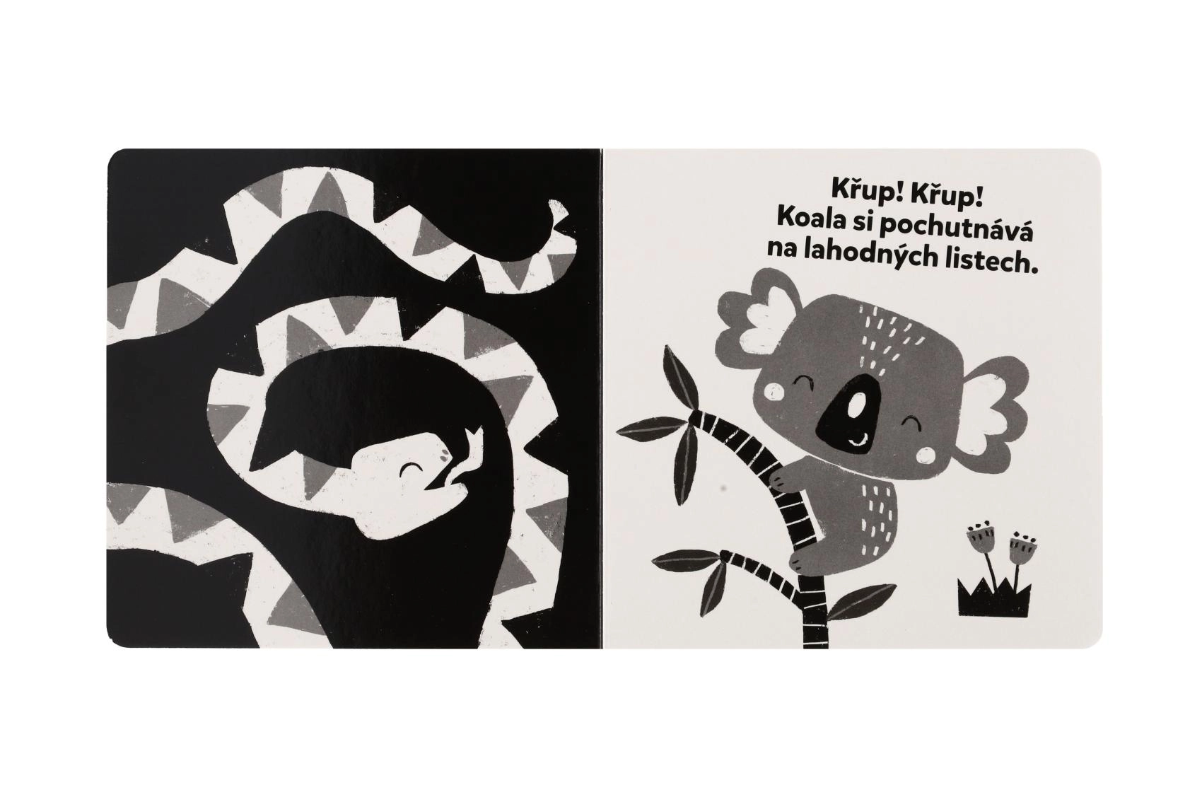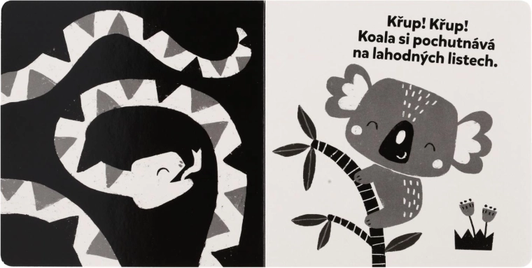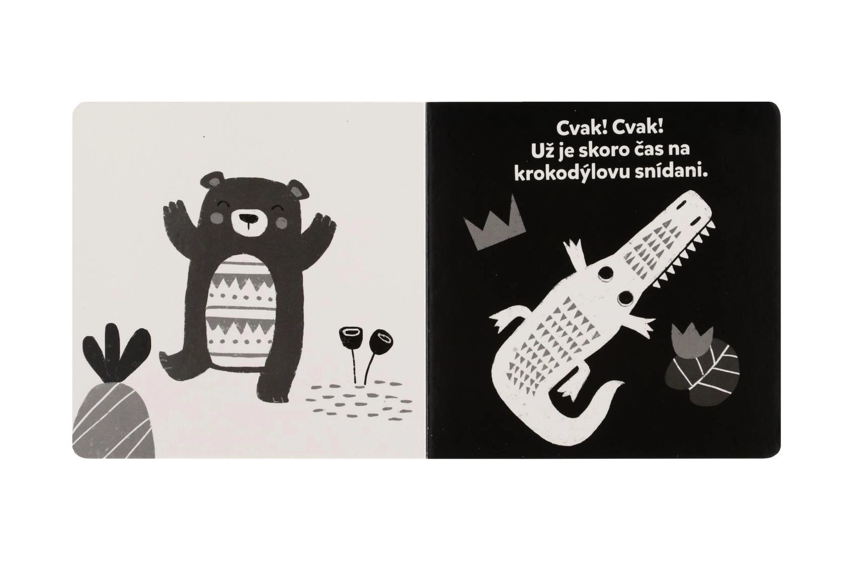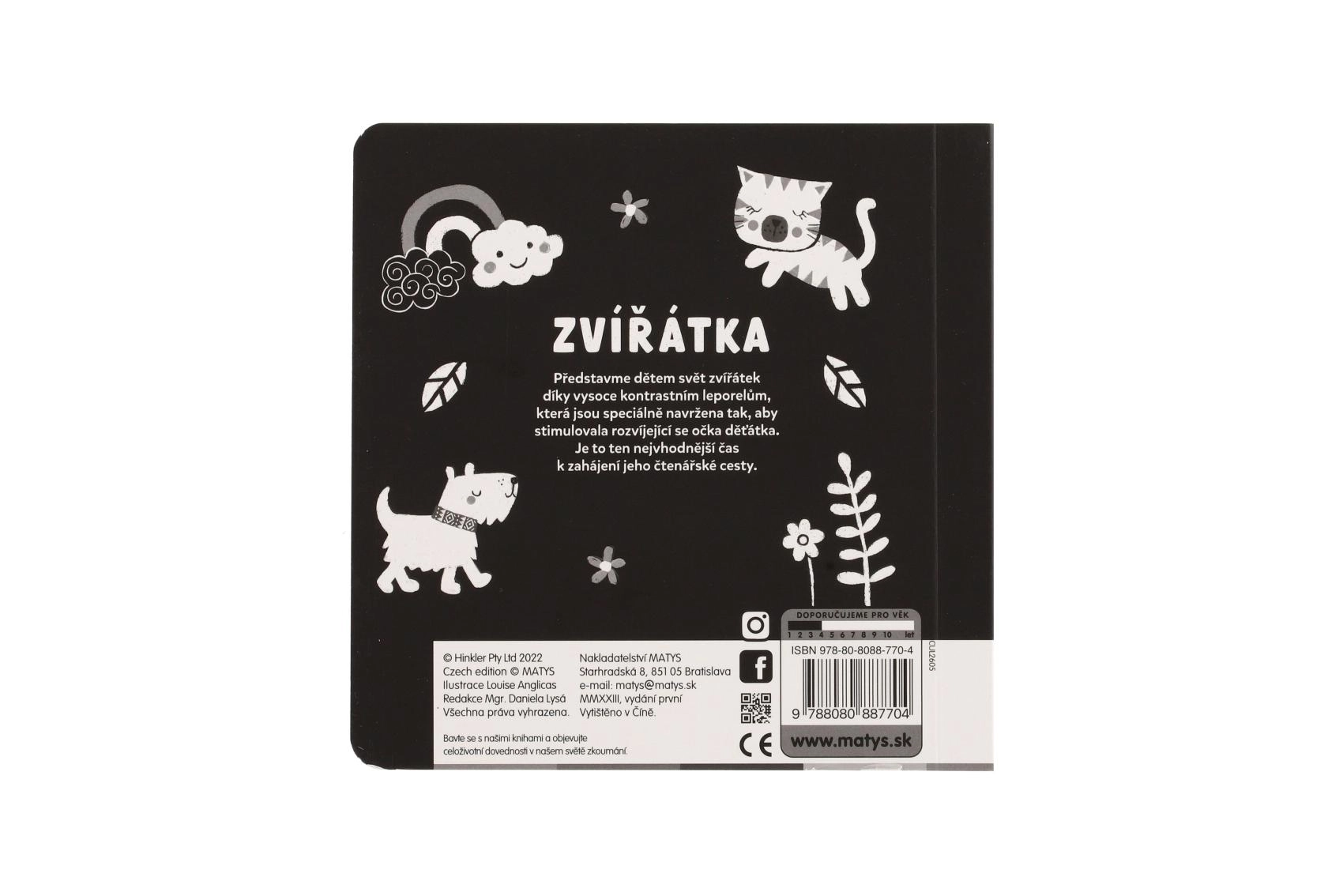 Ta visokokontrastna kartonka je posebej zasnovana za novorojenčke in dojenčke. Črno-beli motivi z jasnimi oblikami in preprostimi silhuetami živali pomagajo dojenčku izostriti pogled ter naravno spodbujajo njegov vidni razvoj. Zahvaljujoč kompaktni obliki se knjigica dobro drži in zlahka spravi v voziček ali previjalno torbo.